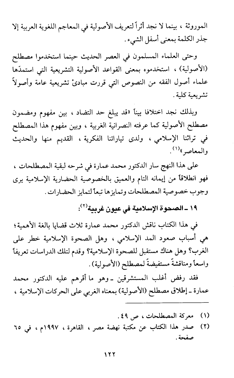 عمارة - إطلاق مصطلح (الاضولية) بمعناه الغربي على الحركات الإسلامية،
