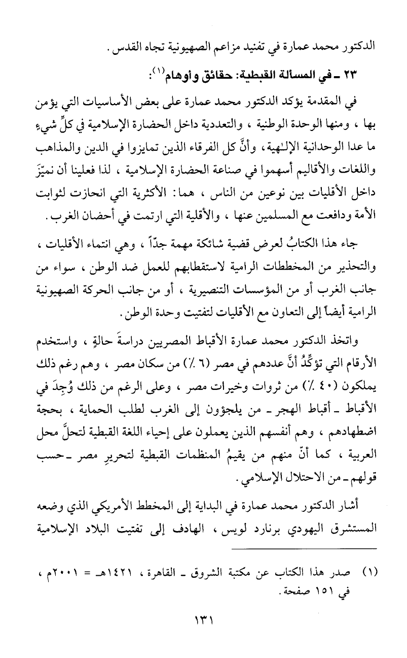 واتخذ الدكتور محمد عمارة الاقباط المصريين دراسةَ حالةٍ، واستخدم