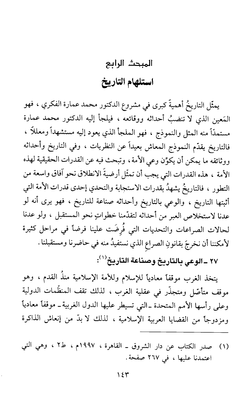 يمثّل التاريخُ أهميةً كبرى في مشروع الدكتور محمد عمارة الفكري، فهو