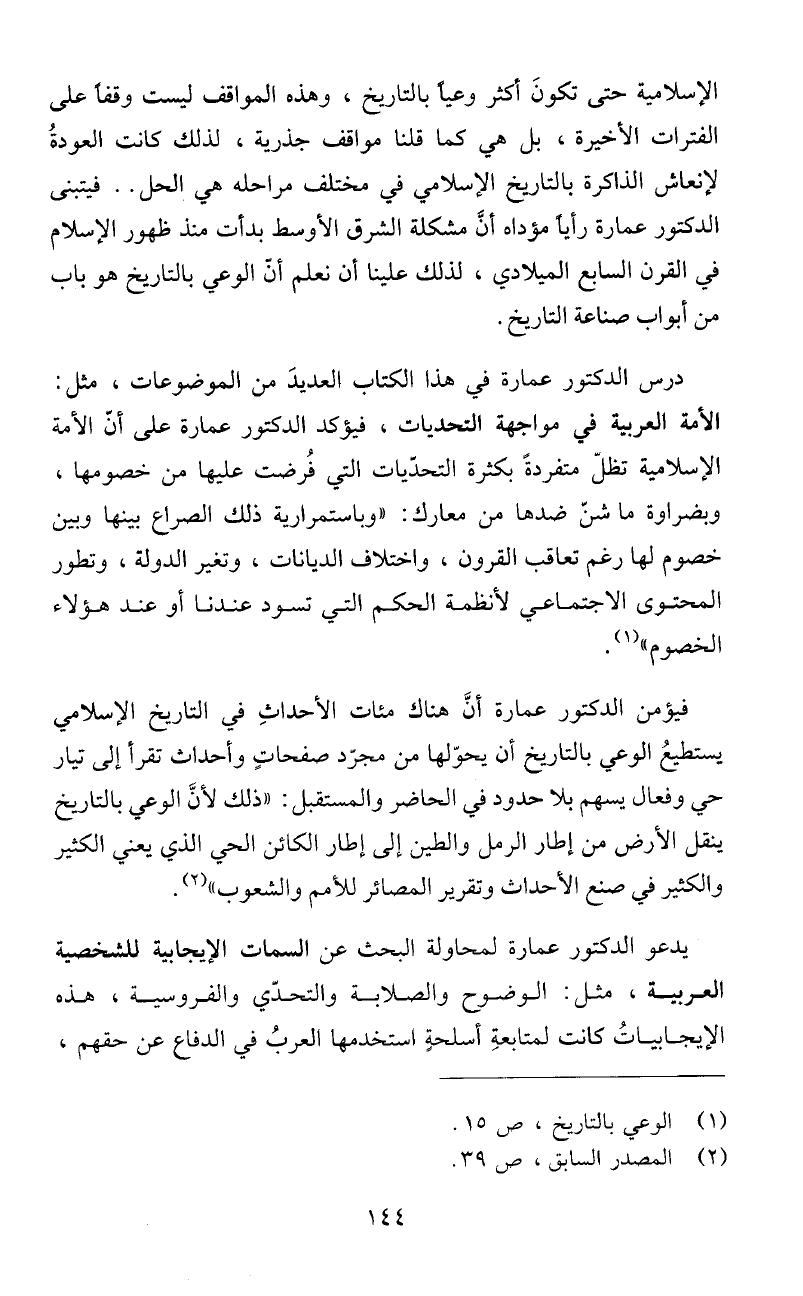 الأمة العربية في مواجهة التحديات، فيؤكد الدكتور عمارة على أنّ الأمة