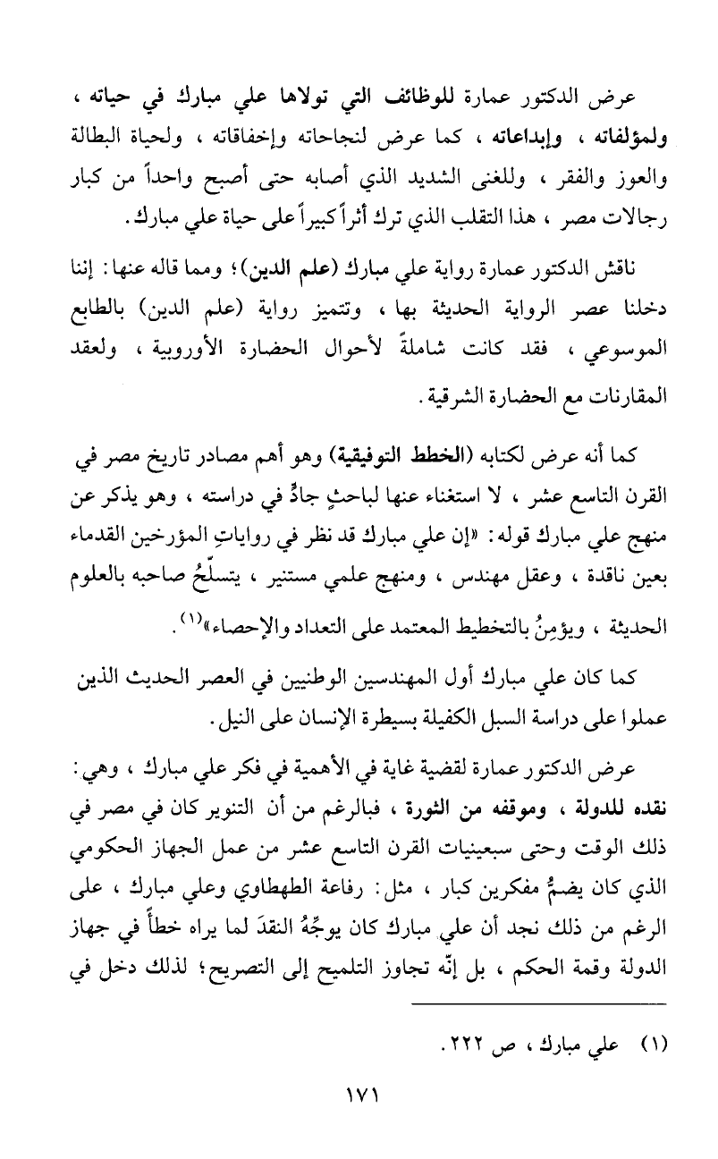 ناقش الدكتور عمارة رواية علي مبارك (علم الدين)؟ ومما قاله عنها: إننا