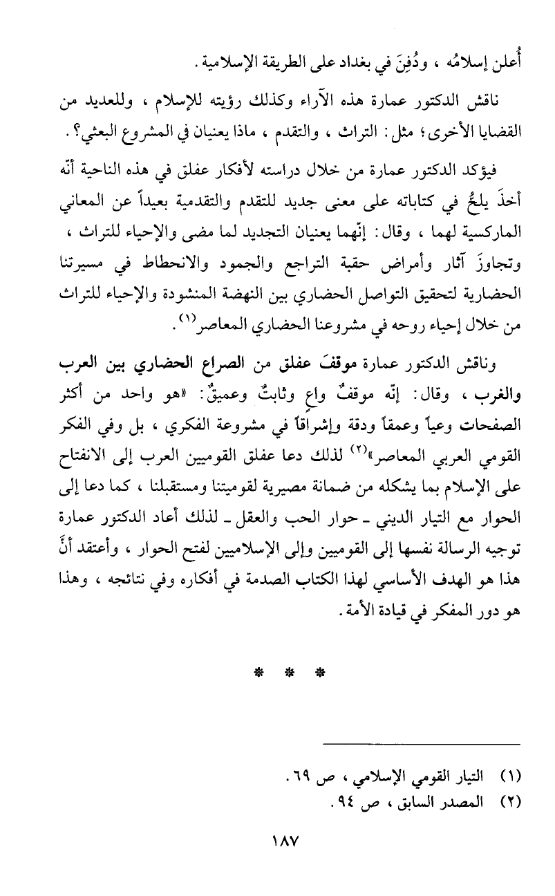 وناقش الدكتور عمارة موقفَ عفلق من الصراع الحضاري بين العرب