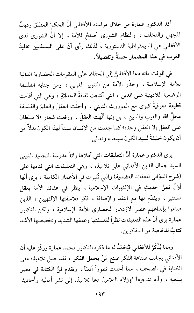 أكد الدكتور عمارة من خلال دراسته للأفغاني أنَّ الحكمَ المطلق رديفٌ