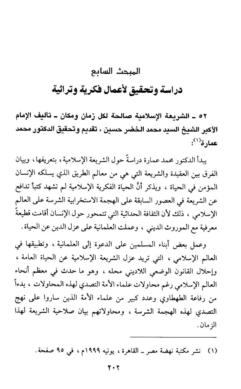 يبدأ الدكتور محمد عمارة دراسةً حول الشريعة الإسلامية، بتعريفها، وبيان