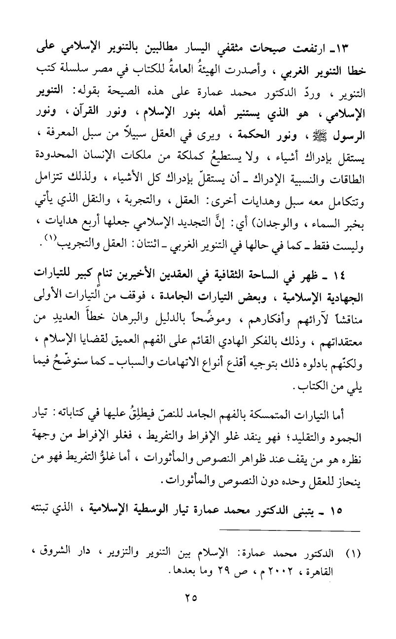 15 - يتبنى الدكتور محمد عمارة تيار الوسطية الإسلامية، الذي تبنته