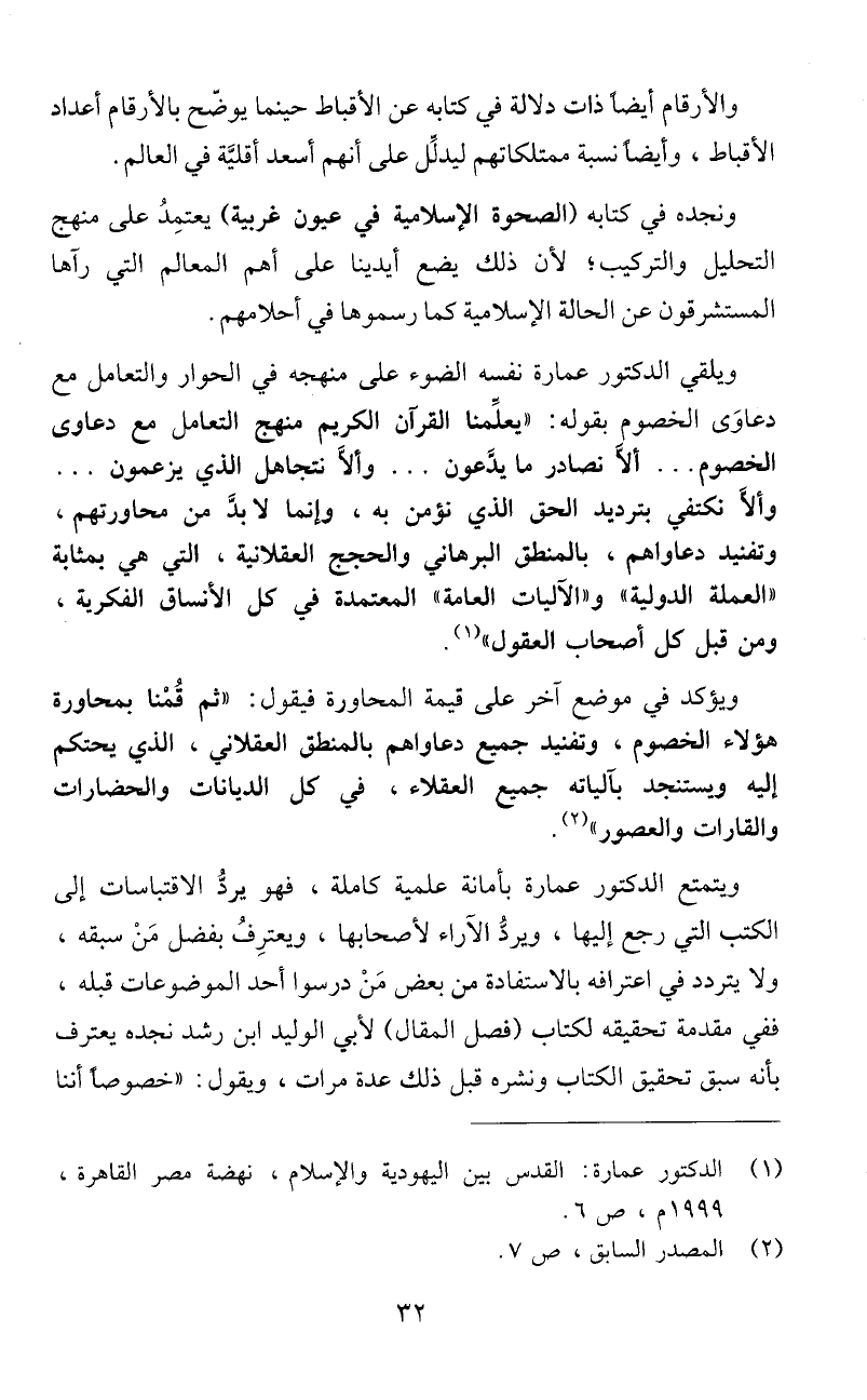 ويتمتع الدكتور عمارة بأمانة علمية كاملة، فهو يردُّ الاقتباسات إلى