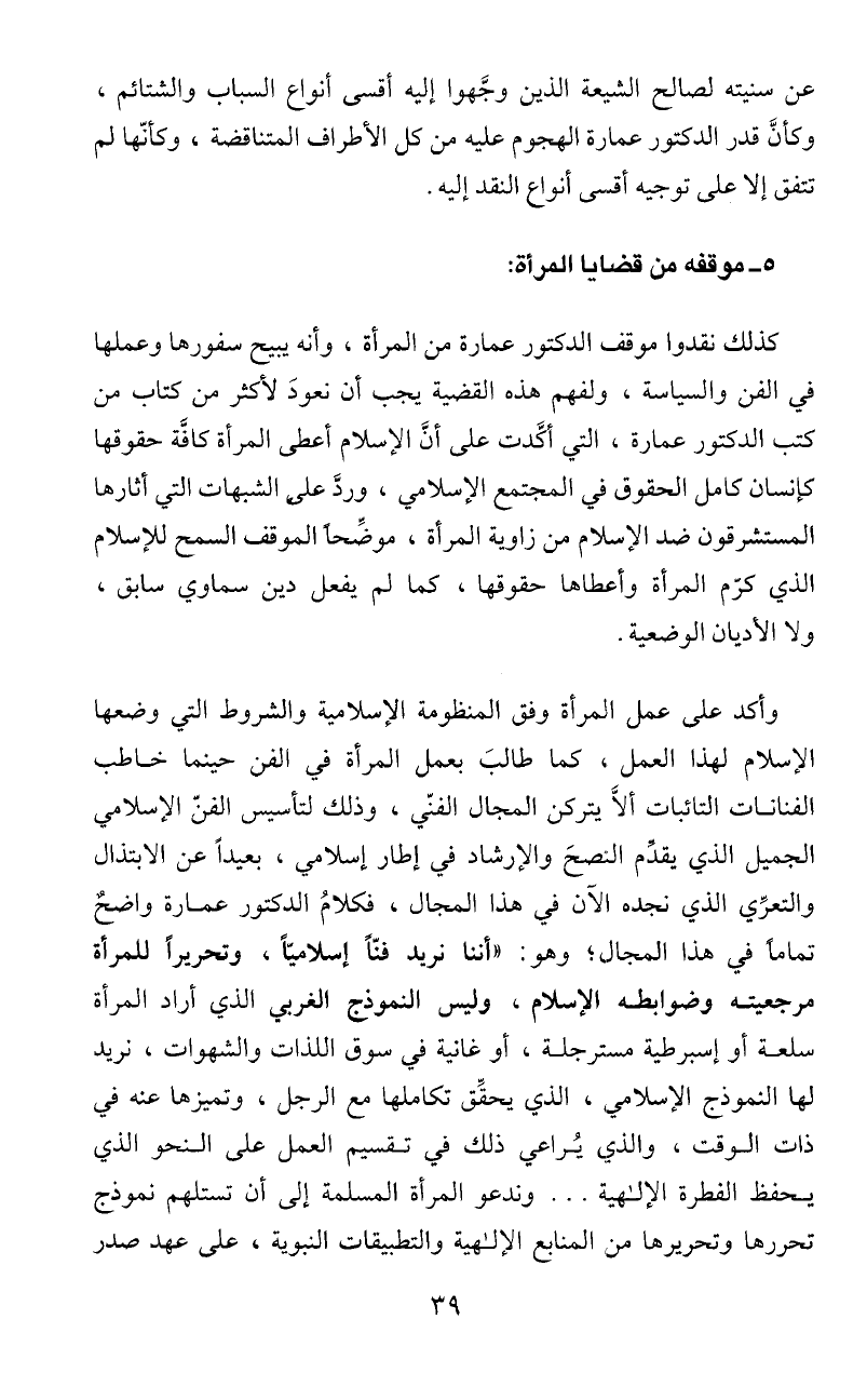 كذلك نقدوا موقف الدكتور عمارة من المراة، وأنه يبيج سفورها وعملها