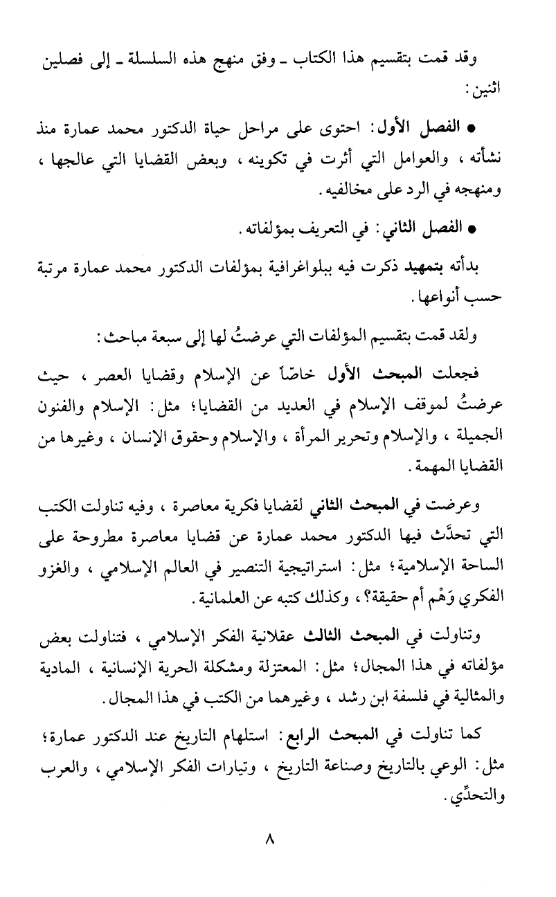 بدأته بتمهيد ذكرت فيه ببلواغرافية بمؤلفات الدكتور محمد عمارة مرتبة
