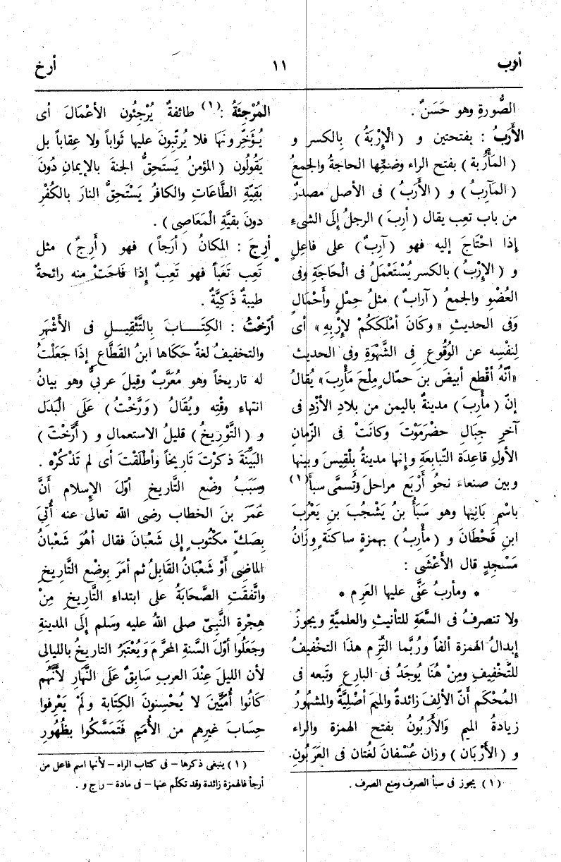 وَفِي الْعُضْوِ وَالْجَمْعُ آرَابٌ مِثْلُ حِمْلٍ وَأَحْمَالٌ وَفِي الْحَدِيثِ «وَكَانَ أَمْلَكَكُمْ لِإِرْبِهِ» أَيْ لِنَفْسِهِ عَنْ الْوُقُوعِ فِي الشَّهْوَةِ وَفِي الْحَدِيثِ «أَنَّهُ أَقْطَعَ أَبْيَضَ بْنَ حَمَّالٍ مِلْحَ مَأْرِبَ» يُقَالُ إنَّ مَأْرِبَ مَدِينَةٌ بِالْيَمَنِ مِنْ بِلَادِ الْأَزْدِ فِي آخِرِ جِبَالِ حَضْرَمَوْتَ وَكَانَتْ فِي الزَّمَانِ الْأَوَّلِ قَاعِدَةَ التَّبَابِعَةِ وَإِنَّهَا مَدِينَةُ بِلْقِيسَ وَبَيْنَهَا وَبَيْنَ صَنْعَاءَ نَحْوُ أَرْبَعِ مَرَاحِلَ وَتُسَمَّى سَبَأَ (¬1) بِاسْمِ بَانِيهَا وَهُوَ سَبَأُ بْنُ يَشْجُبَ بْنِ يَعْرُبَ بْنِ قَحْطَانَ وَمَأْرَبُ بِهَمْزَةٍ سَاكِنَةٍ وِزَانُ مَسْجِدٍ قَالَ الْأَعْشَى