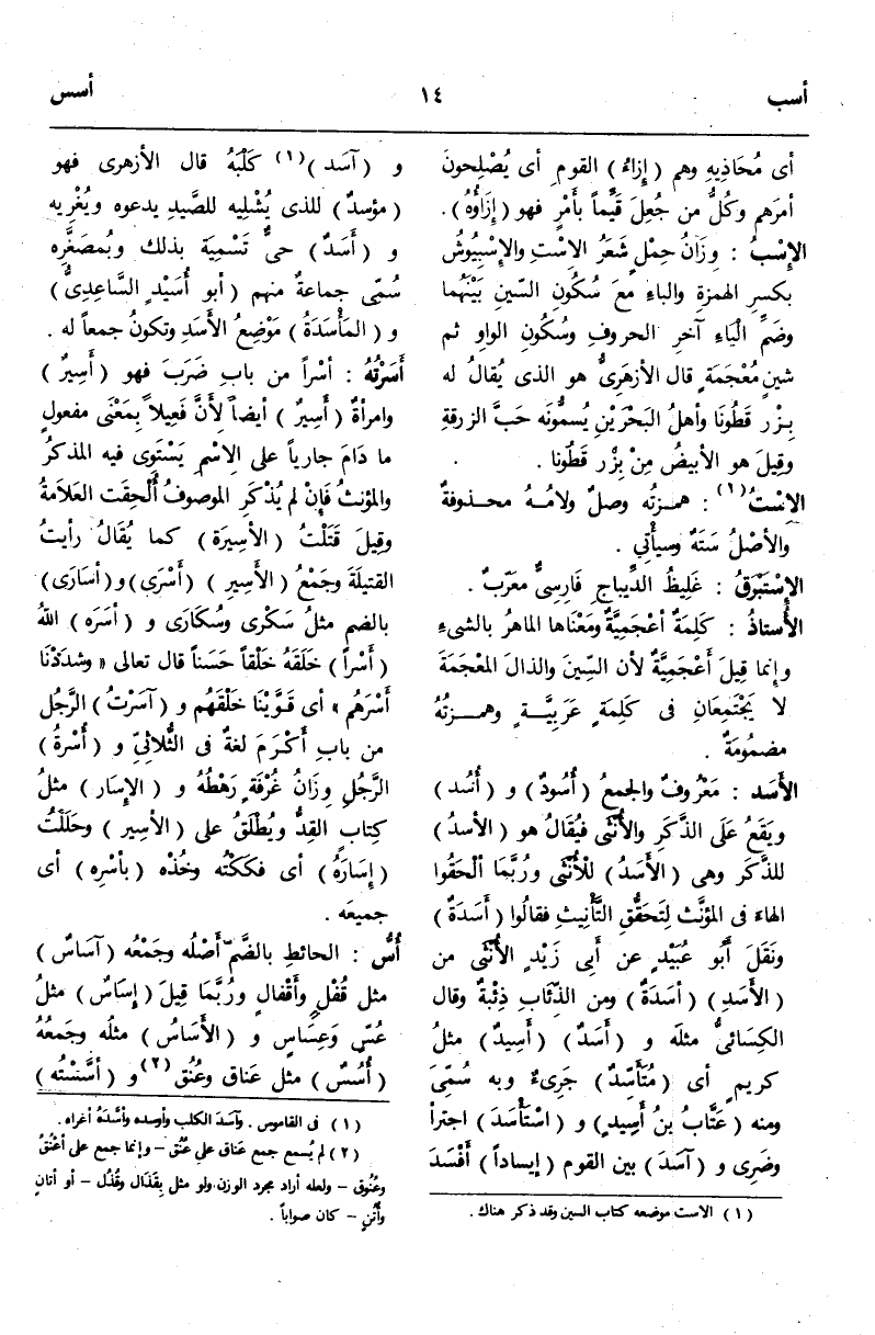 (ء س د) : الْأَسَدُ مَعْرُوفٌ وَالْجَمْعُ أُسُودٌ وَأُسُدٌ وَيَقَعُ عَلَى الذَّكَرِ وَالْأُنْثَى فَيُقَالُ هُوَ الْأَسَدُ لِلذَّكَرِ وَهِيَ الْأَسَدُ لِلْأُنْثَى وَرُبَّمَا أَلْحَقُوا الْهَاءَ فِي الْمُؤَنَّثِ لِتَحَقُّقِ التَّأْنِيثِ فَقَالُوا أَسَدَةٌ وَنَقَلَ أَبُو عُبَيْدٍ عَنْ أَبِي زَيْدٍ الْأُنْثَى مِنْ الْأَسَدِ أَسَدَةٌ وَمِنْ الذِّئَابِ ذِئْبَةٌ وَقَالَ الْكِسَائِيُّ مِثْلَهُ وَأَسَدٌ أَسِيدٌ مِثْلُ كَرِيمٍ أَيْ مُتَأَسِّدٌ جَرِيءٌ وَبِهِ سُمِّيَ وَمِنْهُ عَتَّابُ بْنُ أَسِيدٍ وَاسْتَأْسَدَ اجْتَرَأَ وَضَرِيَ وَآسَدَ بَيْنَ الْقَوْمِ إيسَادًا أَفْسَدَ وَآسَدَ (¬1) كَلْبَهُ.