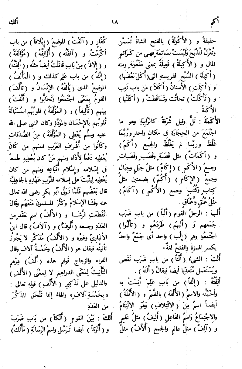 (ء ل ف) : أَلِفْته إلْفًا مِنْ بَابِ عَلِمَ أَنِسْت بِهِ وَأَحْبَبْته وَالِاسْمُ الْأُلْفَةُ بِالضَّمِّ وَالْأُلْفَةُ أَيْضًا اسْمٌ مِنْ الِائْتِلَافِ وَهُوَ الِالْتِئَامُ وَالِاجْتِمَاعُ وَاسْمُ الْفَاعِلِ أَلِيفٌ مِثْلُ عَلِيمٍ وَآلِفٌ مِثْلُ عَالِمٍ وَالْجَمْعُ أُلَّافٌ مِثْلُ كُفَّارٍ وَآلَفْتُ الْمَوْضِعَ إيلَافًا مِنْ بَابِ أَكْرَمْت وَآلَفْتُهُ أُؤَالِفُهُ مُؤَالَفَةً وَإِلَافًا مِنْ بَابِ قَاتَلْت أَيْضًا مِثْلُهُ وَأَلِفْته إلْفًا مِنْ بَابِ عَلِمَ كَذَلِكَ وَالْمَأْلَفُ الْمَوْضِعُ الَّذِي يَأْلَفُهُ الْإِنْسَانُ وَتَأَلَّفَ الْقَوْمُ بِمَعْنَى اجْتَمَعُوا وَتَحَابُّوا وَأَلَّفْت بَيْنَهُمْ تَأْلِيفًا.