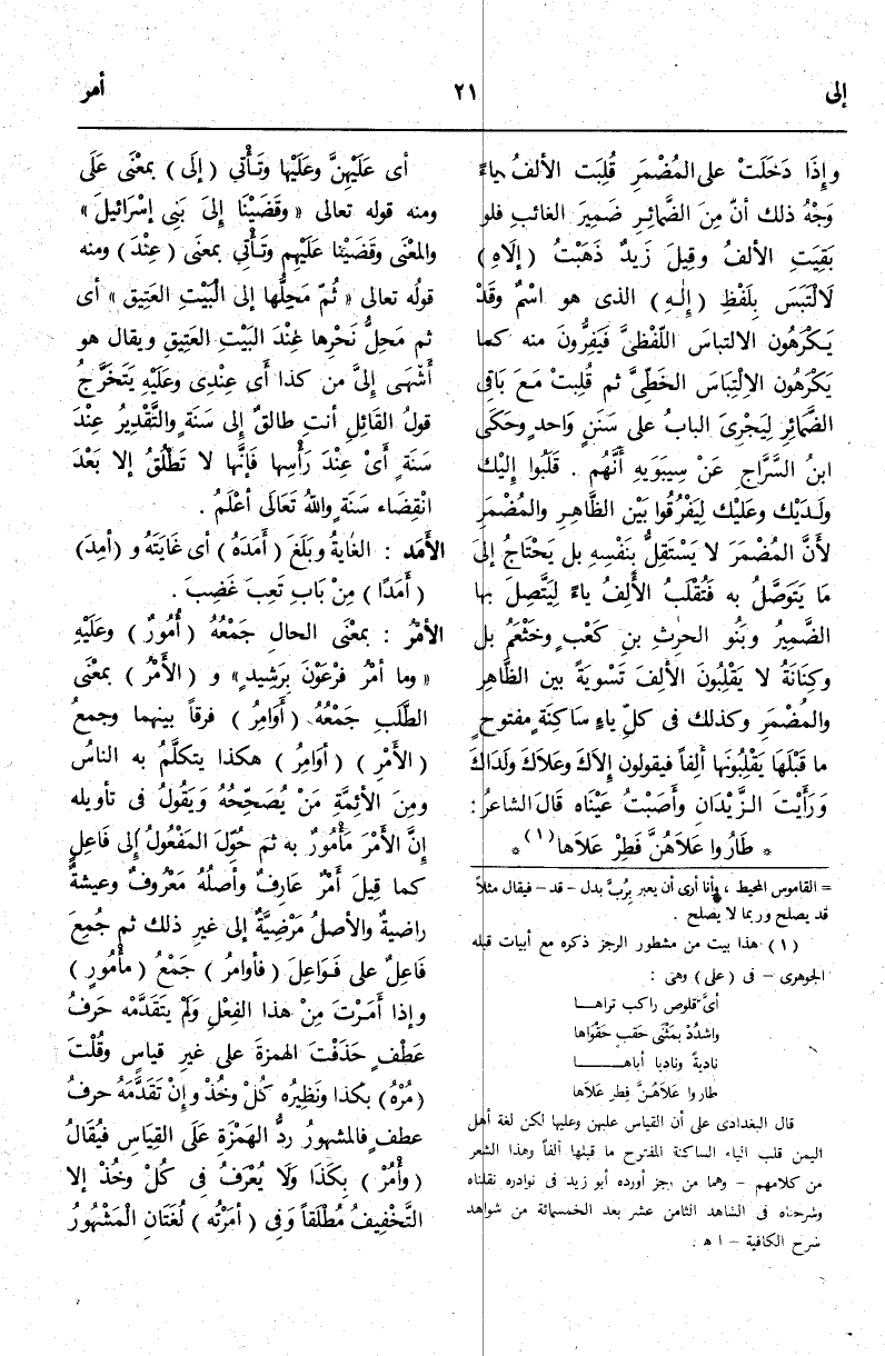 قَالَ أَبُو عُبَيْدٍ وَهُمَا لُغَتَانِ جَيِّدَتَانِ وَآمَرْته فِي أَمْرِي بِالْمَدِّ إذَا شَاوَرْته وَالْإِمْرَةُ وَالْإِمَارَةُ الْوِلَايَةُ بِكَسْرِ الْهَمْزَةِ يُقَالُ أَمَّرَ عَلَى الْقَوْمِ يَأْمُرُ مِنْ بَابِ قَتَلَ فَهُوَ أَمِيرٌ وَالْجَمْعُ الْأُمَرَاءُ وَيُعَدَّى بِالتَّضْعِيفِ فَيُقَالُ أَمَّرْته تَأْمِيرًا فَتَأَمَّرَ وَالْأَمَارَةُ الْعَلَامَةُ وَزْنًا وَمَعْنًى وَلَك عَلَيَّ أَمْرَةٌ لَا أَعْصِيهَا بِالْفَتْحِ أَيْ مَرَّةٌ وَاحِدَةٌ وَأَمِرَ الشَّيْءُ يَأْمَرُ مِنْ بَابِ تَعِبَ كَثُرَ وَيُعَدَّى بِالْحَرَكَةِ وَالْهَمْزَةِ يُقَالُ أَمَرْته أَمْرًا مِنْ بَابِ قَتَلَ وَآمَرْته وَالْأَمْرُ الْحَالَةُ يُقَالُ أَمْرٌ مُسْتَقِيمٌ وَالْجَمْعُ أُمُورٌ مِثْلُ فَلْسٍ وَفُلُوسٍ وَأَمَرْته فَائْتَمَرَ أَيْ سَمِعَ وَأَطَاعَ وَائْتَمَرَ بِالشَّيْءِ هَمَّ بِهِ وَائْتَمَرُوا تَشَاوَرُوا وَقَوْلُهُمْ أَقَلُّ الْأَمْرَيْنِ أَوْ أَكْثَرُ الْأَمْرَيْنِ مِنْ كَذَا وَكَذَا الْوَجْهُ أَنْ يَكُونَ بِالْوَاوِ لِأَنَّهَا عَاطِفَةٌ عَلَى مِنْ وَنَائِبَةٌ عَنْ تَكْرِيرِهَا وَالْأَصْلُ مِنْ كَذَا وَمِنْ كَذَا فَإِنَّ مِنْ كَذَا وَكَذَا تَفْسِيرٌ لِلْأَمْرَيْنِ مُطَابِقٌ لَهُمَا فِي التَّعَدُّدِ مُوَضِّحٌ لِمَعْنَاهُمَا وَلَوْ قِيلَ مِنْ كَذَا أَوْ مِنْ كَذَا بِالْأَلِفِ لَبَقِيَ الْمَعْنَى أَقَلَّ الْأَمْرَيْنِ إمَّا مِنْ هَذَا وَإِمَّا مِنْ هَذَا وَكَانَ أَحَدُهُمَا لَا بِعَيْنِهِ مُفَسِّرًا لِلِاثْنَيْنِ وَهُوَ مُمْتَنِعٌ لِمَا فِيهِ مِنْ الْإِبْهَامِ وَلِأَنَّ الْوَاحِدَ لَا يَكُونُ لَهُ أَقَلُّ أَوْ أَكْثَرُ إلَّا أَنْ يُقَالَ بِالْمَذْهَبِ الْكُوفِيِّ وَهُوَ إيقَاعُ أَوْ مَوْقِعَ الْوَاوِ.