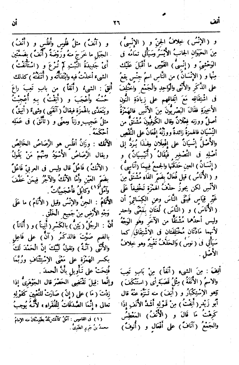 (ء ن ك) : الْآنُكُ وِزَانُ أَفْلُسٍ هُوَ الرَّصَاصُ الْخَالِصُ وَيُقَالُ الرَّصَاصُ الْأَسْوَدُ وَمِنْهُمْ مَنْ يَقُولُ الْآنُكُ فَاعِلٌ قَالَ وَلَيْسَ فِي الْعَرَبِيِّ فَاعُلٌ بِضَمِّ الْعَيْنِ وَأَمَّا الْآنُكُ وَالْآجُرُّ فِيمَنْ خَفَّفَ وَآمُلُ (¬1) وَكَابُلُ فَأَعْجَمِيَّاتٌ.