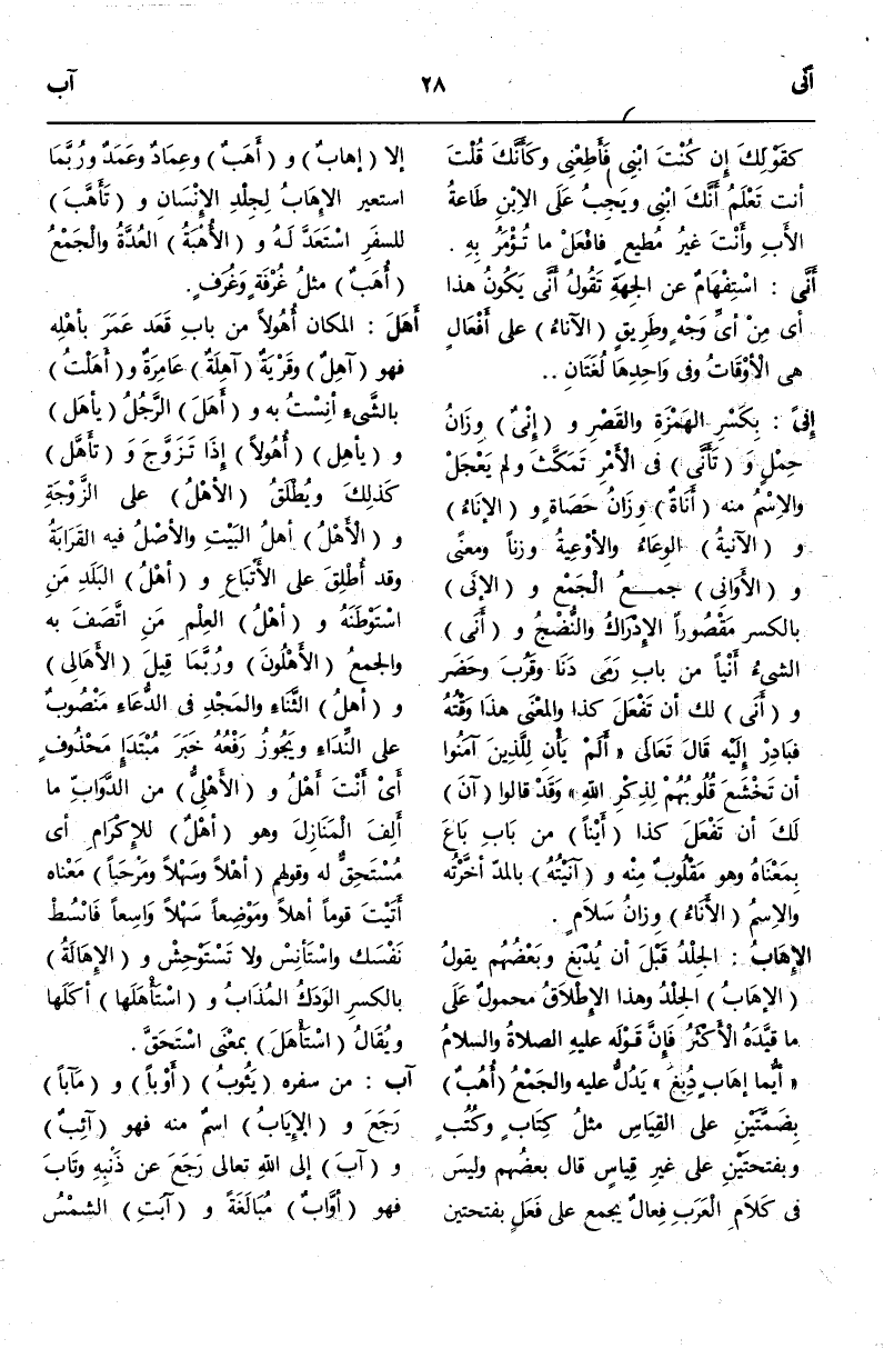 (ء هـ ل) : أَهَلَ الْمَكَانُ أُهُولًا مِنْ بَابِ قَعَدَ عَمَرَ بِأَهْلِهِ فَهُوَ آهِلٌ وَقَرْيَةٌ آهِلَةٌ عَامِرَةٌ وَأَهَلْت بِالشَّيْءِ أَنِسْت بِهِ وَأَهَلَ الرَّجُلُ يَأْهَلُ وَيَأْهِلُ أُهُولًا إذَا تَزَوَّجَ وَتَأَهَّلَ كَذَلِكَ وَيُطْلَقُ الْأَهْلُ عَلَى الزَّوْجَةِ وَالْأَهْلُ أَهْلُ الْبَيْتِ وَالْأَصْلُ فِيهِ الْقَرَابَةُ وَقَدْ أُطْلِقَ عَلَى الْأَتْبَاعِ وَأَهْلُ الْبَلَدِ مَنْ اسْتَوْطَنَهُ.