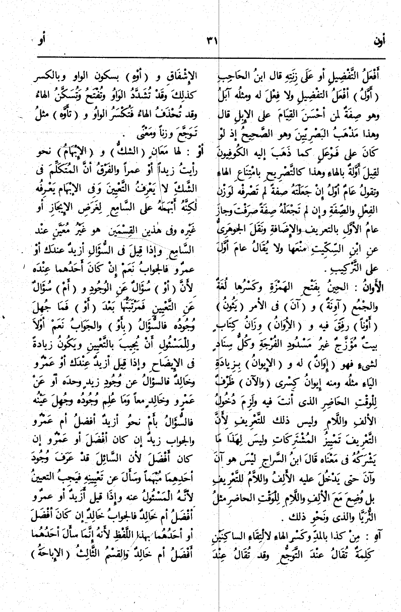 (أو) : أَوْ لَهَا مَعَانٍ الشَّكُّ وَالْإِبْهَامُ نَحْوُ رَأَيْت زَيْدًا أَوْ عَمْرًا وَالْفَرْقُ أَنَّ الْمُتَكَلِّمَ فِي الشَّكِّ لَا يَعْرِفُ التَّعْيِينَ وَفِي الْإِبْهَامِ يَعْرِفُهُ لَكِنَّهُ أَبْهَمَهُ عَلَى السَّامِعِ لِغَرَضِ الْإِيجَازِ أَوْ غَيْرِهِ وَفِي هَذَيْنِ الْقِسْمَيْنِ هُوَ غَيْرُ مُعَيَّنٍ عِنْدَ السَّامِعِ وَإِذَا قِيلَ فِي السُّؤَالِ أَزَيْدٌ عِنْدَك أَوْ عَمْرٌو فَالْجَوَابُ نَعَمْ إنْ كَانَ أَحَدُهُمَا عِنْدَهُ لِأَنَّ أَوْ سُؤَالٌ عَنْ الْوُجُودِ وَأَمْ سُؤَالٌ عَنْ التَّعْيِينِ فَمَرْتَبَتُهَا بَعْدَ أَوْ فَمَا جُهِلَ وُجُودُهُ فَالسُّؤَالُ بِأَوْ وَالْجَوَابُ نَعَمْ أَوْ لَا وَلِلْمَسْئُولِ أَنْ يُجِيبَ بِالتَّعْيِينِ وَيَكُونُ زِيَادَةً فِي الْإِيضَاحِ وَإِذَا قِيلَ أَزَيْدٌ عِنْدَك أَوْ عَمْرٌو وَخَالِدٌ فَالسُّؤَالُ عَنْ وُجُودِ زَيْدٍ وَحْدَهُ أَوْ عَنْ وُجُودِ عَمْرٍو وَخَالِدٍ مَعًا وَمَا عُلِمَ وُجُودُهُ وَجُهِلَ عَيْنُهُ فَالسُّؤَالُ بِأَمْ نَحْوُ أَزَيْدٌ أَفْضَلُ أَمْ عَمْرٌو وَالْجَوَابُ زَيْدٌ إنْ كَانَ أَفْضَلَ أَوْ عَمْرٌو إنْ كَانَ أَفْضَلَ لِأَنَّ السَّائِلَ قَدْ عَرَفَ وُجُودَ أَحَدِهِمَا مُبْهَمًا وَسَأَلَ عَنْ تَعْيِينِهِ فَيَجِبُ التَّعْيِينُ لِأَنَّهُ الْمَسْئُولُ عَنْهُ وَإِذَا قِيلَ أَزَيْدٌ أَوْ عَمْرٌو أَفْضَلُ أَمْ خَالِدٌ فَالْجَوَابُ خَالِدٌ إنْ كَانَ أَفْضَلَ أَوْ أَحَدُهُمَا بِهَذَا اللَّفْظِ لِأَنَّهُ إنَّمَا سَأَلَ أَحَدُهُمَا أَفْضَلُ أَمْ خَالِدٌ وَالْقِسْمُ الثَّالِثُ الْإِبَاحَةُ
