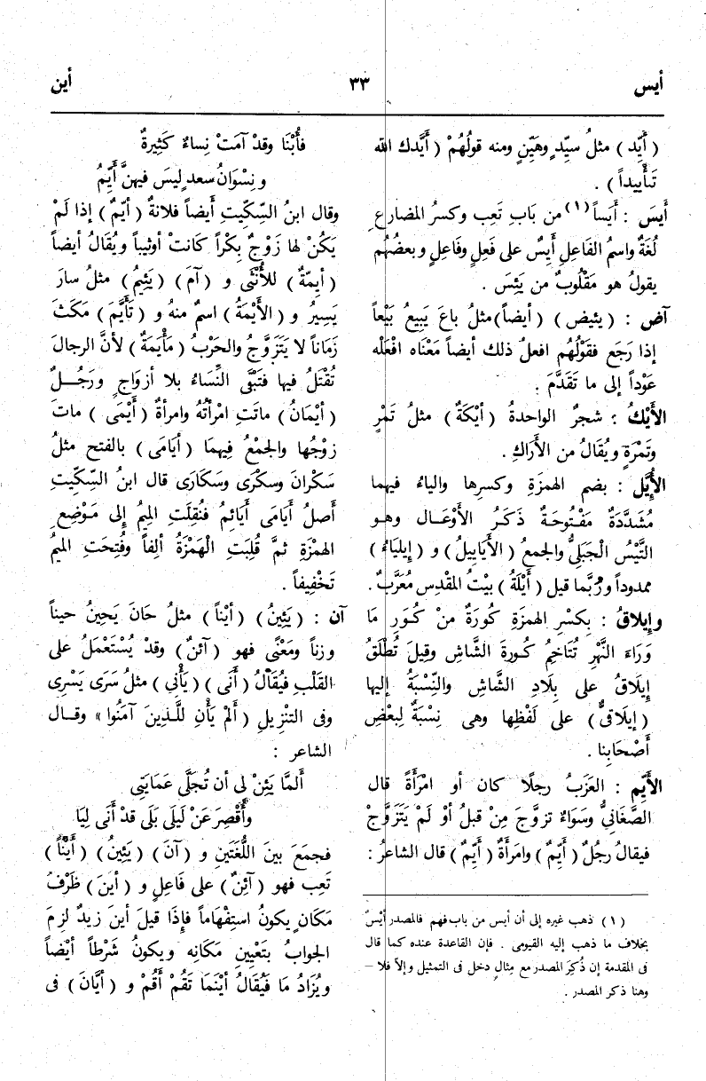 فَجَمَعَ بَيْنَ اللُّغَتَيْنِ وَآنَ يَئِينُ أَيْنًا تَعِبَ فَهُوَ آئِنٌ عَلَى فَاعِلٍ وَأَيْنَ ظَرْفُ مَكَان يَكُونُ اسْتِفْهَامًا فَإِذَا قِيلَ أَيْنَ زَيْدٌ لَزِمَ الْجَوَابُ بِتَعْيِينِ مَكَانِهِ وَيَكُونُ شَرْطًا أَيْضًا وَيُزَادُ مَا فَيُقَالُ أَيْنَمَا تَقُمْ أَقُمْ وَأَيَّانَ فِي