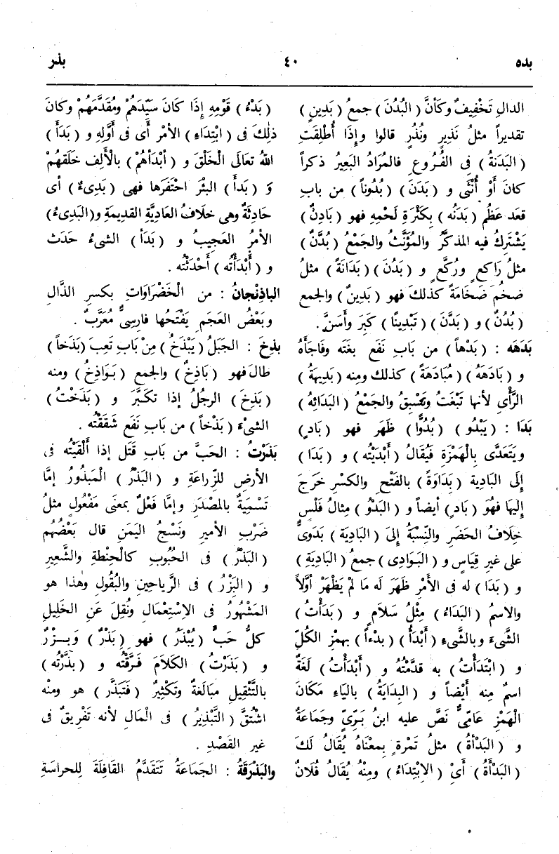 (ب د ي) : بَدَا يَبْدُو بُدُوًّا ظَهَرَ فَهُوَ بَادٍ وَيَتَعَدَّى بِالْهَمْزَةِ فَيُقَالُ أَبْدَيْته وَبَدَا إلَى الْبَادِيَةِ بَدَاوَةً بِالْفَتْحِ وَالْكَسْرِ خَرَجَ إلَيْهَا فَهُوَ بَادٍ أَيْضًا وَالْبَدْوُ مِثَالُ فَلْسٍ خِلَافُ الْحَضَرِ وَالنِّسْبَةِ إلَى الْبَادِيَةِ بَدَوِيٌّ عَلَى غَيْرِ قِيَاسٍ وَالْبَوَادِي جَمْعُ الْبَادِيَةِ وَبَدَا لَهُ فِي الْأَمْرِ ظَهَرَ لَهُ مَا لَمْ يَظْهَرْ أَوَّلًا وَالِاسْمُ الْبَدَاءُ مِثْلُ: سَلَامٍ وَبَدَأْت الشَّيْءَ وَبِالشَّيْءِ أَبْدَأُ بَدْءًا بِهَمْزِ الْكُلِّ وَابْتَدَأْت بِهِ قَدَّمْته وَأَبْدَأْت لُغَةٌ وَالْبُدَاءَةُ بِالْكَسْرِ وَالْمَدِّ وَضَمُّ الْأَوَّلِ لُغَةٌ اسْمٌ مِنْهُ أَيْضًا وَالْبِدَايَةُ بِالْيَاءِ مَكَانَ الْهَمْزِ عَامِّيٌّ نَصَّ عَلَيْهِ ابْنُ بَرِّيٍّ وَجَمَاعَةٌ وَالْبَدْأَةُ مِثْلُ: تَمْرَةٍ بِمَعْنَاهُ يُقَالُ لَك الْبَدْأَةُ أَيْ الِابْتِدَاءُ وَمِنْهُ يُقَالُ فُلَانٌ بَدْءُ قَوْمِهِ إذَا كَانَ سَيِّدَهُمْ وَمُقَدَّمَهُمْ وَكَانَ ذَلِكَ فِي ابْتِدَاءِ الْأَمْرِ أَيْ فِي أَوَّلِهِ وَبَدَأَ اللَّهُ تَعَالَى الْخَلْقَ وَأَبْدَأَهُمْ بِالْأَلِفِ خَلَقَهُمْ وَبَدَأَ الْبِئْرَ احْتَفَرَهَا فَهِيَ بَدِيءٌ أَيْ حَادِثَةٌ وَهِيَ خِلَافُ الْعَادِيَةِ الْقَدِيمَةِ وَالْبَدِيءُ الْأَمْرُ الْعَجِيبُ وَبَدَأَ الشَّيْءُ حَدَثَ وَأَبْدَأْته أَحْدَثْته.