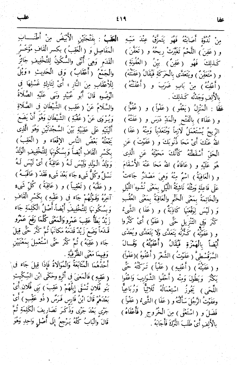 أَيْ أَخَّرْتُ لِأَعْلَمَ آخِرَ أَمْرِهِمْ وَقِيلَ مَا جَهِلْتُ بَعْدَهُمْ وَسَافَرْتُ وَخُلِّفَ فُلَانٌ بِعَقِبِي أَيْ أَقَامَ بَعْدِي وَعَقَّبْتُ زَيْدًا عَقْبًا مِنْ بَابِ قَتَلَ وَعُقُوبًا جِئْتُ بَعْدَهُ وَمِنْهُ سُمِّيَ رَسُولُ اللَّهِ - صَلَّى اللهُ عَلَيْهِ وَسَلَّمَ - الْعَاقِبَ لِأَنَّهُ عَقَبَ مَنْ كَانَ قَبْلَهُ مِنْ الْأَنْبِيَاءِ أَيْ جَاءَ بَعْدَهُمْ وَرَجَعَ فُلَانٌ عَلَى عَقِبِهِ أَيْ عَلَى طَرِيقِ عَقِبِهِ وَهِيَ الَّتِي كَانَتْ خَلْفَهُ وَجَاءَ مِنْهَا سَرِيعًا وَالْمَعْنَى الثَّانِي إدْرَاكُ جُزْءٍ مِنْ الْمَذْكُورِ مَعَهُ يُقَالُ جَاءَ فِي عَقِبِ رَمَضَانَ إذَا جَاءَ وَقَدْ بَقِيَ مِنْهُ بَقِيَّةٌ وَيُقَالُ إذَا بَرِئَ الْمَرِيضُ وَبَقِيَ شَيْءٌ مِنْ الْمَرَضِ هُوَ فِي عَقِبِ الْمَرَضِ وَأَمَّا عَقِيبٌ مِثَالُ كَرِيمٍ فَاسْمُ فَاعِلٍ مِنْ قَوْلِهِمْ عَاقَبَهُ مُعَاقَبَةً وَعَقَّبَهُ تَعْقِيبًا فَهُوَ مُعَاقِبٌ وَمُعَقِّبٌ وَعَقِيبٌ إذَا جَاءَ بَعْدَهُ.