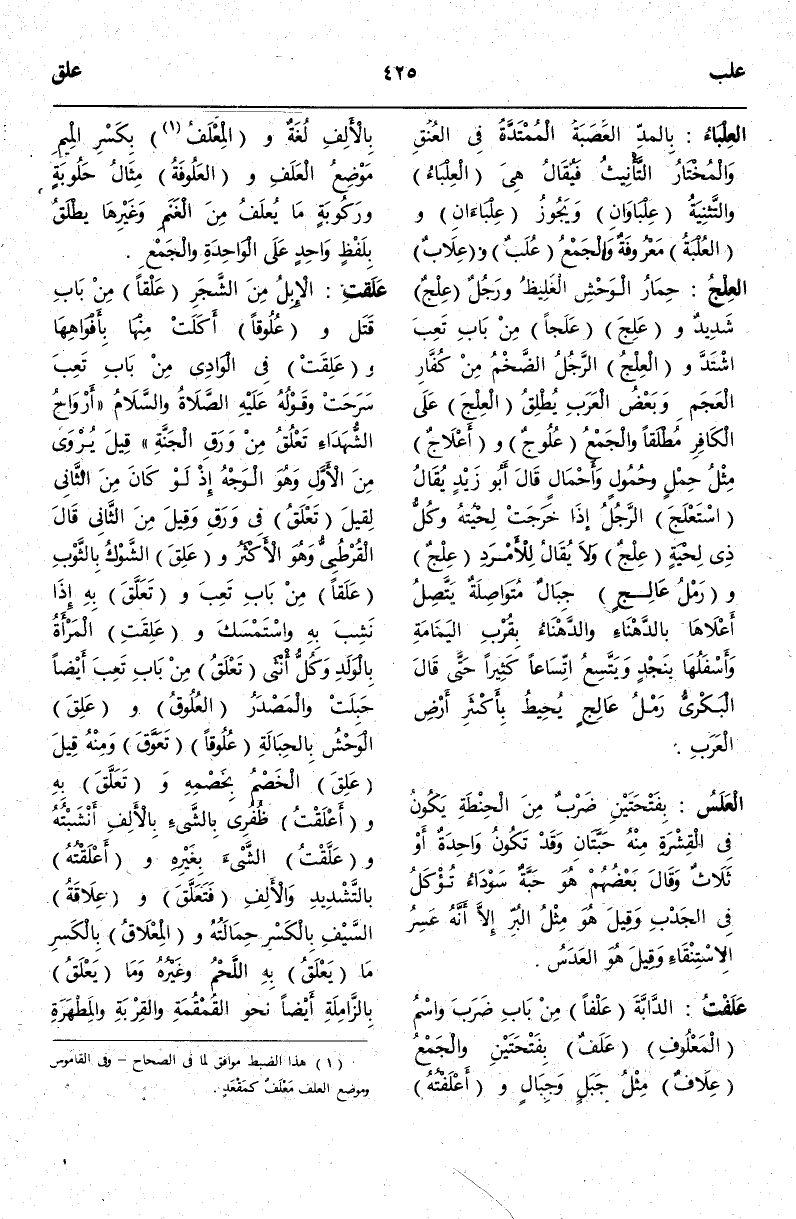 (ع ل ف) : عَلَفْتُ الدَّابَّةَ عَلْفًا مِنْ بَابِ ضَرَبَ وَاسْمُ الْمَعْلُوفِ عَلَفٌ بِفَتْحَتَيْنِ وَالْجَمْعُ عِلَافٌ مِثْلُ جَبَلٍ وَجِبَالٍ وَأَعْلَفْتُهُ بِالْأَلِفِ لُغَةٌ وَالْمِعْلَفُ (¬1) بِكَسْرِ الْمِيمِ مَوْضِعُ الْعَلَفِ وَالْعَلُوفَةُ مِثَالُ حَلُوبَةٍ وَرَكُوبَةٍ مَا يُعْلَفُ مِنْ الْغَنَمِ وَغَيْرِهَا يُطْلَقُ بِلَفْظٍ وَاحِدٍ عَلَى الْوَاحِدَةِ وَالْجَمْعِ.