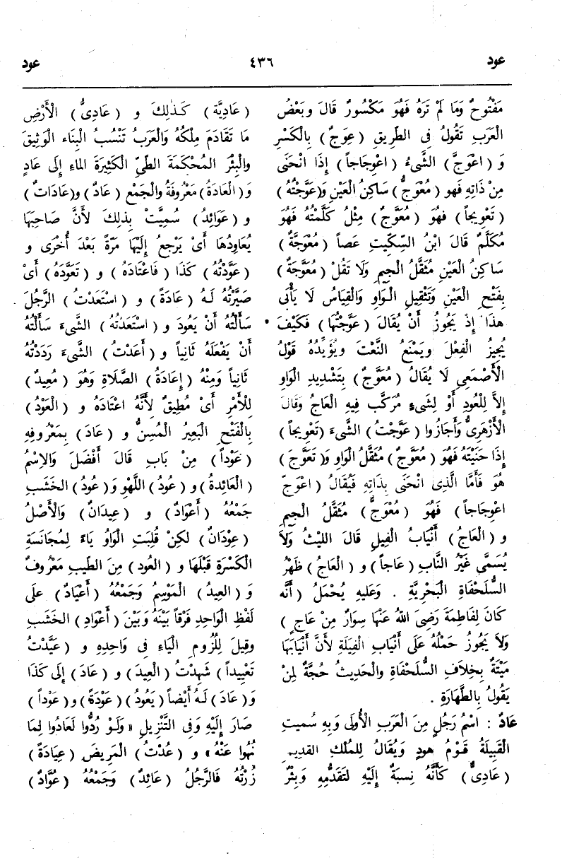 (ع ود) : عَادٌ اسْمُ رَجُلٍ مِنْ الْعَرَبِ الْأُولَى وَبِهِ سُمِّيَتْ الْقَبِيلَةُ قَوْمُ هُودٍ وَيُقَالُ لِلْمِلْكِ الْقَدِيمِ عَادِيٌّ كَأَنَّهُ نِسْبَةٌ إلَيْهِ لَتَقَدُّمِهِ وَبِئْرٌ عَادِيَّةٌ كَذَلِكَ وَعَادِيُّ الْأَرْضِ مَا تَقَادَمَ مِلْكُهُ وَالْعَرَبُ تَنْسُبُ الْبِنَاءَ الْوَثِيقَ وَالْبِئْرَ الْمُحْكَمَةَ الطَّيِّ الْكَثِيرَةَ الْمَاءِ إلَى عَادٍ وَالْعَادَةُ مَعْرُوفَةُ وَالْجَمْعُ عَادٌ وَعَادَاتٌ وَعَوَائِدُ سُمِّيَتْ بِذَلِكَ لِأَنَّ صَاحِبَهَا يُعَاوِدُهَا أَيْ يَرْجِعُ إلَيْهَا مَرَّةً بَعْدَ أُخْرَى.