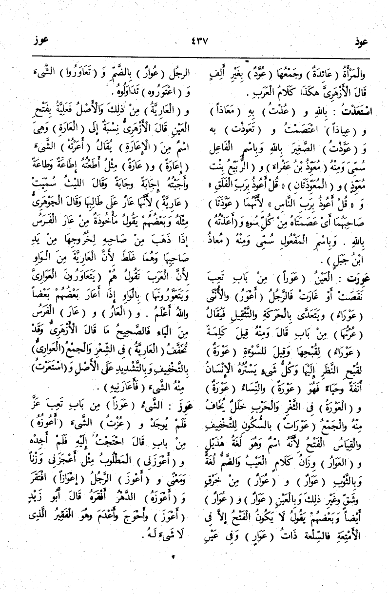 (ع وذ) : اسْتَعَذْتُ بِاَللَّهِ وَعُذْتُ بِهِ مَعَاذًا وَعِيَاذًا اعْتَصَمْتُ وَتَعَوَّذْت بِهِ وَعَوَّذْتُ الصَّغِيرَ بِاَللَّهِ وَبِاسْمِ الْفَاعِلِ سُمِّيَ وَمِنْهُ مُعَوِّذُ ابْنُ عَفْرَاءَ وَالرُّبَيِّعُ بِنْتُ مُعَوِّذٍ وَالْمُعَوِّذَتَانِ {قُلْ أَعُوذُ بِرَبِّ الْفَلَقِ} [الفلق: 1] وَ {قُلْ أَعُوذُ بِرَبِّ النَّاسِ} [الناس: 1] لِأَنَّهُمَا عَوَّذَتَا صَاحِبَهُمَا أَيْ عَصَمَتَاهُ مِنْ كُلِّ سُوءٍ وَأَعَذْتُهُ بِاَللَّهِ وَبِاسْمِ الْمَفْعُولِ سُمِّيَ وَمِنْهُ مُعَاذُ بْنُ جَبَلٍ.