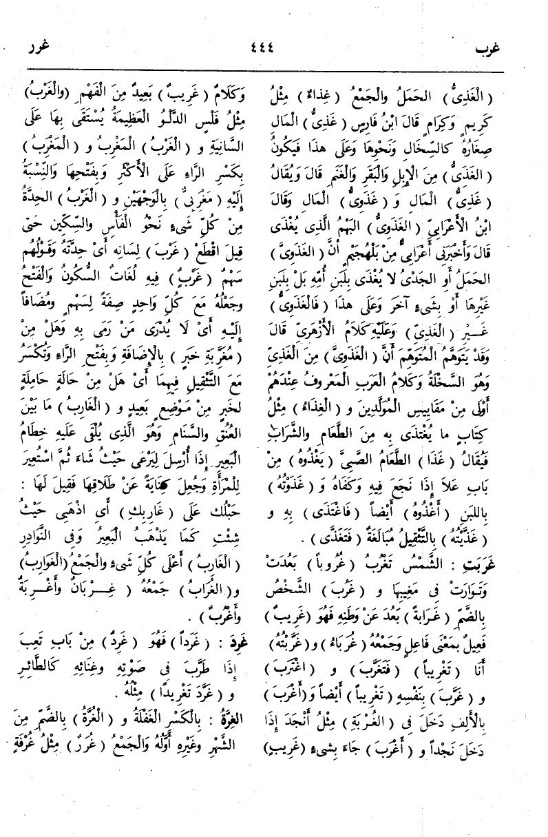 (غ ر ب) : غَرَبَتْ الشَّمْسُ تَغْرُبُ غُرُوبًا بَعُدَتْ وَتَوَارَتْ فِي مَغِيبِهَا وَغَرُبَ الشَّخْصُ بِالضَّمِّ غَرَابَةً بَعُدَ عَنْ وَطَنِهِ فَهُوَ غَرِيبٌ فَعِيلٌ بِمَعْنَى فَاعِلٍ وَجَمْعُهُ غُرَبَاءُ وَغَرَّبْتُهُ أَنَا تَغْرِيبًا فَتَغَرَّبَ وَاغْتَرَبَ وَغَرَّبَ بِنَفْسِهِ تَغْرِيبًا أَيْضًا وَأَغْرَبَ بِالْأَلِفِ دَخَلَ فِي الْغُرْبَةِ مِثْلُ أَنْجَدَ إذَا دَخَلَ نَجْدًا وَأَغْرَبَ جَاءَ بِشَيْءٍ غَرِيبٍ وَكَلَامٌ غَرِيبٌ بَعِيدٌ مِنْ الْفَهْمِ.