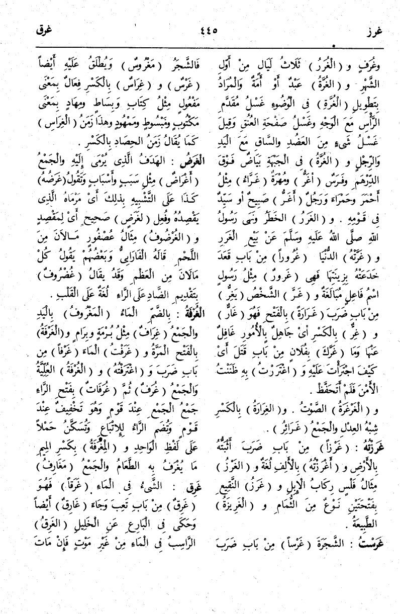 -[446]- غَرَقًا فَهُوَ غَرِيقٌ مِثْلُ كَرِيمٍ هَذَا كَلَامُ الْعَرَبِ وَجَوَّزَ فِي الْبَارِعِ الْوَجْهَيْنِ فِي الْقِيَاسِ وَعَلَى مَا نُقِلَ عَنْ الْخَلِيلِ مِنْ الْفَرْقِ بَيْنَ الْغَرِقِ وَالْغَرِيقِ فَقَوْلُ الْفُقَهَاءِ لِإِنْقَاذِ غَرِيقٍ إنْ أُرِيدَ الْإِخْرَاجُ مِنْ الْمَاءِ فَهُوَ ظَاهِرٌ وَإِنْ أُرِيدَ خَلَاصُهُ وَسَلَامَتُهُ مِنْ الْهَلَاكِ فَهُوَ مُحَالٌ لِأَنَّ الْمَيِّتَ لَا يُتَصَوَّرُ سَلَامَتُهُ وَجَمْعُ الْغَرِيقِ غَرْقَى مِثْلُ قَتِيلٍ وَقَتْلَى وَيُعَدَّى بِالْهَمْزَةِ وَالتَّضْعِيفِ فَيُقَالُ أَغْرَقْتُهُ وَغَرَّقْتُهُ وَأَغْرَقَ الرَّامِي فِي الْقَوْسِ اسْتَوْفَى مَدَّهَا وَأَغْرَقَ فِي الشَّيْءِ بَالَغَ فِيهِ وَأَطْنَبَ كِلَاهُمَا بِالْأَلِفِ وَالِاسْتِغْرَاقُ الِاسْتِيعَابُ.