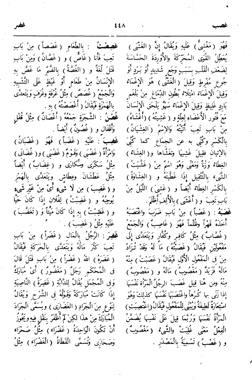 (غ ص ب) : غَصَبَهُ غَصْبًا مِنْ بَابِ ضَرَبَ وَاغْتَصَبَهُ أَخَذَهُ قَهْرًا وَظُلْمًا فَهُوَ غَاصِبٌ وَالْجَمْعُ غُصَّابٌ مِثْلُ كَافِرٍ وَكُفَّارٍ وَيَتَعَدَّى إلَى مَفْعُولَيْنِ فَيُقَالُ غَصَبْتُهُ مَالَهُ وَقَدْ تُزَادُ مِنْ فِي الْمَفْعُولِ الْأَوَّلِ فَيُقَالُ غَصَبْتُ مِنْهُ مَالَهُ فَزَيْدٌ مَغْصُوبٌ مَالُهُ وَمَغْصُوبٌ مِنْهُ وَمِنْ هُنَا قِيلَ غَصَبَ الرَّجُلُ الْمَرْأَةَ نَفْسَهَا إذَا زَنَى بِهَا كُرْهًا وَاغْتَصَبَهَا نَفْسَهَا كَذَلِكَ وَهُوَ اسْتِعَارَةٌ لَطِيفَةٌ وَيُبْنَى لِلْمَفْعُولِ فَيُقَالُ اُغْتُصِبَتْ الْمَرْأَةُ نَفْسُهَا وَرُبَّمَا قِيلَ عَلَى نَفْسِهَا يُضَمَّنُ الْفِعْلُ مَعْنَى غُلِبَتْ وَالشَّيْءُ مَغْصُوبٌ وَغَصْبٌ تَسْمِيَةٌ بِالْمَصْدَرِ.