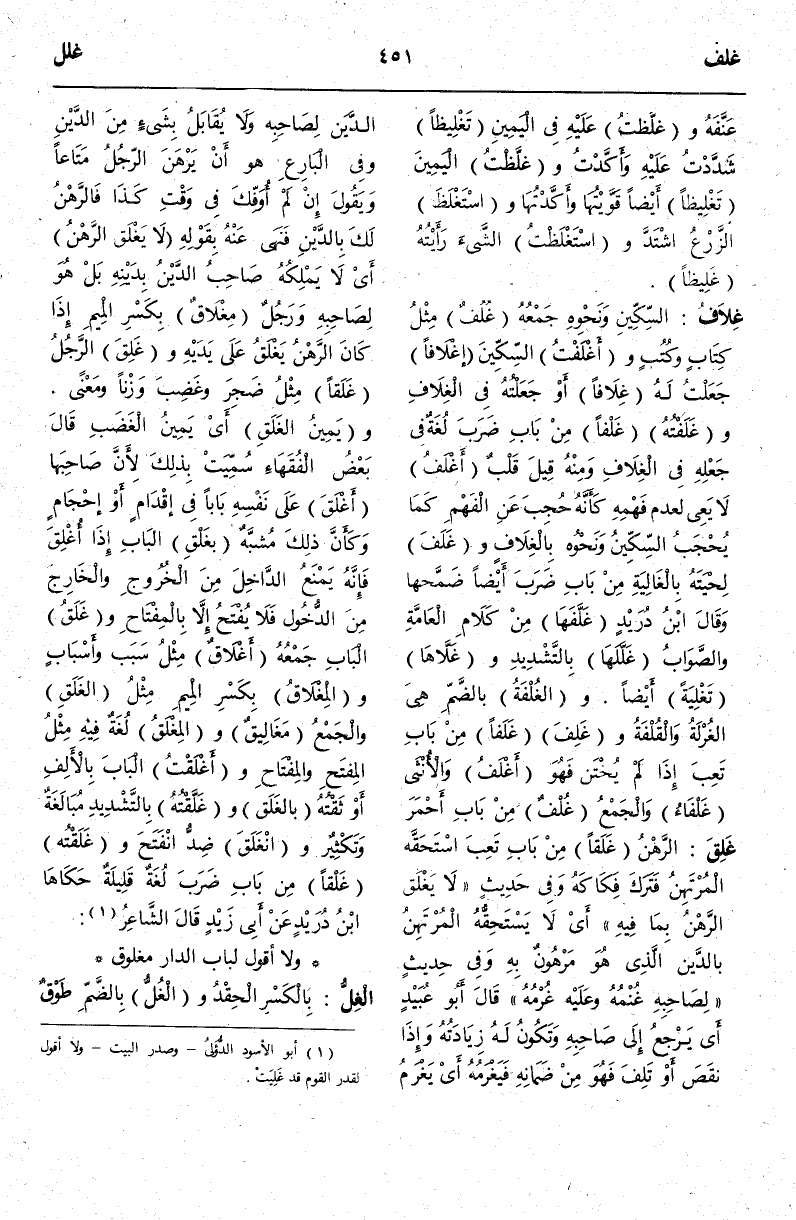 وَالْمِغْلَقُ لُغَةٌ فِيهِ مِثْلُ الْمِفْتَحِ وَالْمِفْتَاحِ وَأَغْلَقْتُ الْبَابَ بِالْأَلِفِ أَوْثَقْتُهُ بِالْغَلَقِ وَغَلَّقْتُهُ بِالتَّشْدِيدِ مُبَالَغَةٌ وَتَكْثِيرٌ وَانْغَلَقَ ضِدُّ انْفَتَحَ وَغَلَقْتُهُ غَلْقًا مِنْ بَابِ ضَرَبَ لُغَةٌ قَلِيلَةٌ حَكَاهَا ابْنُ دُرَيْدٍ عَنْ أَبِي زَيْدٍ قَالَ الشَّاعِرُ (¬1)