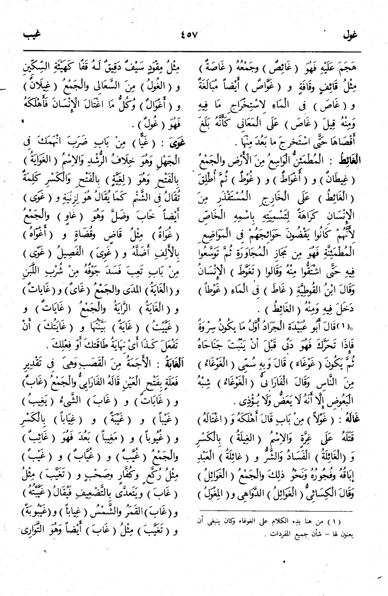 (غ وط) : الْغَائِطُ الْمُطْمَئِنُّ الْوَاسِعُ مِنْ الْأَرْضِ وَالْجَمْعُ غِيطَانٌ وَأَغْوَاطٌ وَغَوْطٌ ثُمَّ أُطْلِقَ الْغَائِطُ عَلَى الْخَارِجِ الْمُسْتَقْذَرِ مِنْ الْإِنْسَانِ كَرَاهَةً لِتَسْمِيَتِهِ بِاسْمِهِ الْخَاصِّ لِأَنَّهُمْ كَانُوا يَقْضُونَ حَوَائِجَهُمْ فِي الْمَوَاضِعِ الْمُطْمَئِنَّةِ فَهُوَ مِنْ مَجَازِ الْمُجَاوَرَةِ ثُمَّ تَوَسَّعُوا فِيهِ حَتَّى اشْتَقُّوا مِنْهُ وَقَالُوا تَغَوَّطَ الْإِنْسَانُ.