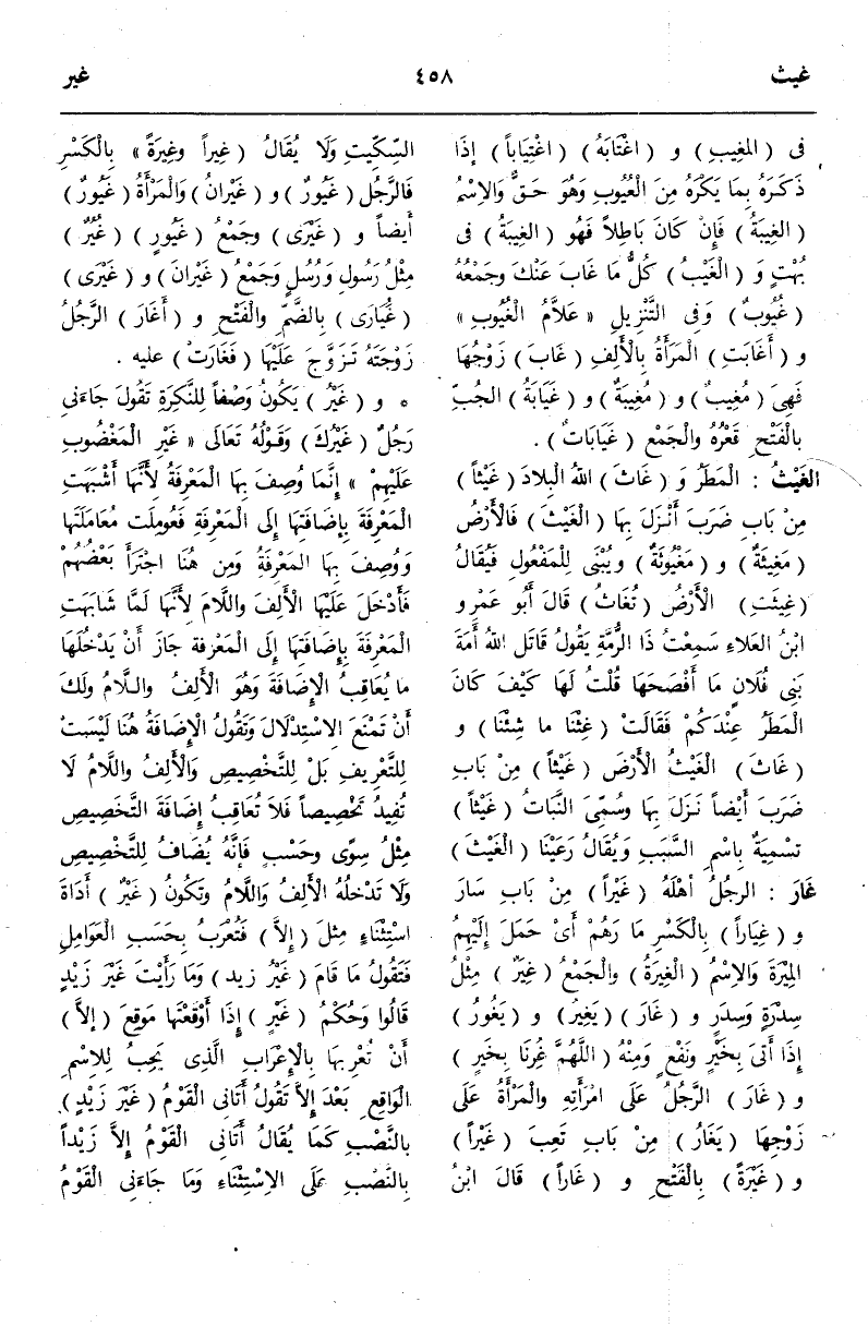 وَغَيْرُ يَكُونُ وَصْفًا لِلنَّكِرَةِ تَقُولُ جَاءَنِي رَجُلٌ غَيْرُكَ وقَوْله تَعَالَى {غَيْرِ الْمَغْضُوبِ عَلَيْهِمْ} [الفاتحة: 7] إنَّمَا وُصِفَ بِهَا الْمَعْرِفَةُ لِأَنَّهَا أَشْبَهَتْ الْمَعْرِفَةَ بِإِضَافَتِهَا إلَى الْمَعْرِفَةِ فَعُومِلَتْ مُعَامَلَتَهَا وَوُصِفَ بِهَا الْمَعْرِفَةُ وَمِنْ هُنَا اجْتَرَأَ بَعْضُهُمْ فَأَدْخَلَ عَلَيْهَا الْأَلِفَ وَاللَّامَ لِأَنَّهَا لَمَّا شَابَهَتْ الْمَعْرِفَةَ بِإِضَافَتِهَا إلَى الْمَعْرِفَةِ جَازَ أَنْ يَدْخُلَهَا مَا يُعَاقِبُ الْإِضَافَةَ وَهُوَ الْأَلِفُ وَاللَّامُ وَلَكَ أَنْ تَمْنَعَ الِاسْتِدْلَالَ وَتَقُولُ الْإِضَافَةُ هُنَا لَيْسَتْ لِلتَّعْرِيفِ بَلْ لِلتَّخْصِيصِ وَالْأَلِفُ وَاللَّامُ لَا تُفِيدُ تَخْصِيصًا فَلَا تُعَاقِبُ إضَافَةَ التَّخْصِيصِ مِثْلُ سِوًى وَحَسْبِ فَإِنَّهُ يُضَافُ لِلتَّخْصِيصِ وَلَا تَدْخُلُهُ الْأَلِفُ وَاللَّامُ وَتَكُونُ غَيْرُ أَدَاةَ اسْتِثْنَاءٍ مِثْلُ إلَّا فَتُعْرَبُ بِحَسْبِ الْعَوَامِلِ فَتَقُولُ مَا قَامَ غَيْرُ زَيْدٍ وَمَا رَأَيْتُ غَيْرَ زَيْدٍ قَالُوا وَحُكْمُ غَيْرٍ إذَا أَوْقَعْتَهَا مَوْقِعَ إلَّا أَنْ تُعْرِبَهَا بِالْإِعْرَابِ الَّذِي يَجِبُ لِلِاسْمِ الْوَاقِعِ بَعْدَ إلَّا تَقُولُ أَتَانِي الْقَوْمُ