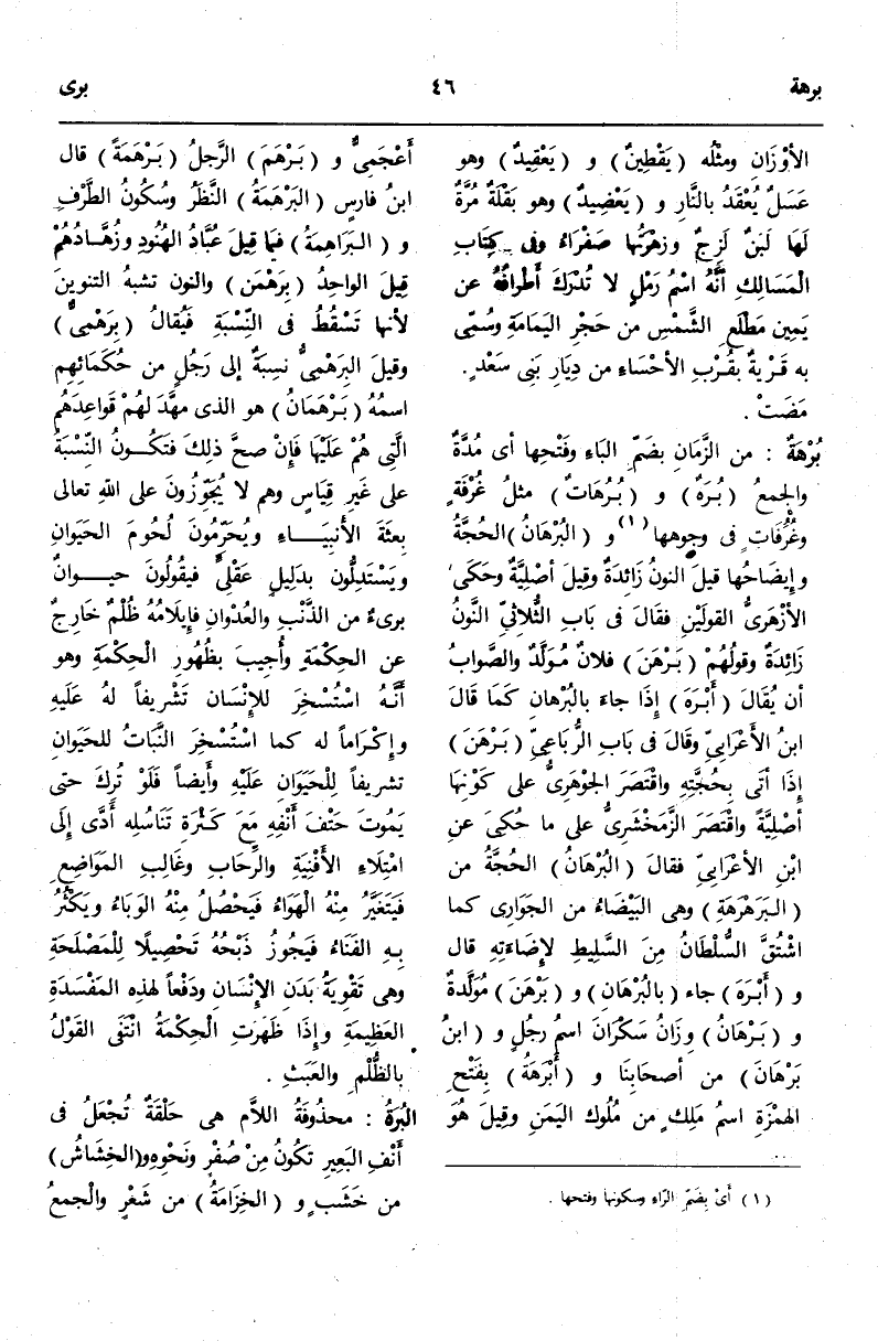 وَبَرْهَمَ الرَّجُلُ بَرْهَمَةً قَالَ ابْنُ فَارِسٍ الْبَرْهَمَةُ النَّظَرُ وَسُكُونُ الطَّرْفِ وَالْبَرَاهِمَةُ فِيمَا قِيلَ عُبَّادُ الْهُنُودِ وَزُهَّادُهُمْ قِيلَ الْوَاحِدُ بَرَهْمَنٍ وَالنُّونُ تُشْبِهُ التَّنْوِينَ لِأَنَّهَا تَسْقُطُ فِي النِّسْبَةِ فَيُقَالُ بَرْهَمِيٍّ وَقِيلَ الْبَرْهَمِيُّ نِسْبَةٌ إلَى رَجُلٍ مِنْ حُكَمَائِهِمْ اسْمُهُ بَرْهَمَانُ هُوَ الَّذِي مَهَّدَ لَهُمْ قَوَاعِدَهُمْ الَّتِي هُمْ عَلَيْهَا فَإِنْ صَحَّ ذَلِكَ فَتَكُونُ النِّسْبَةُ عَلَى غَيْرِ قِيَاسٍ وَهُمْ لَا يُجَوِّزُونَ عَلَى اللَّهِ تَعَالَى بِعْثَةَ الْأَنْبِيَاءِ وَيُحَرِّمُونَ لُحُومَ الْحَيَوَانِ وَيَسْتَدِلُّونَ بِدَلِيلٍ عَقْلِيٍّ فَيَقُولُونَ حَيَوَانٌ بَرِئَ مِنْ الذَّنْبِ وَالْعُدْوَانِ فَإِيلَامُهُ ظُلْمٌ خَارِجٌ عَنْ الْحِكْمَةِ وَأُجِيبَ بِظُهُورِ الْحِكْمَةِ وَهُوَ أَنَّهُ اُسْتُسْخِرَ لِلْإِنْسَانِ تَشْرِيفًا لَهُ عَلَيْهِ وَإِكْرَامًا لَهُ كَمَا اسْتَسْخَرَ النَّبَاتُ لِلْحَيَوَانِ تَشْرِيفًا لِلْحَيَوَانِ عَلَيْهِ وَأَيْضًا فَلَوْ تُرِكَ حَتَّى يَمُوتَ حَتْفَ أَنْفِهِ مَعَ كَثْرَةِ تَنَاسُلِهِ أَدَّى إلَى امْتِلَاءِ الْأَفْنِيَةِ وَالرِّحَابِ وَغَالِبِ الْمَوَاضِعِ فَيَتَغَيَّرُ مِنْهُ الْهَوَاءُ فَيَحْصُلُ مِنْهُ الْوَبَاءُ وَيَكْثُرُ بِهِ الْفَنَاءُ فَيَجُوزُ ذَبْحُهُ تَحْصِيلًا لِلْمَصْلَحَةِ وَهِيَ تَقْوِيَةُ بَدَنِ الْإِنْسَانِ وَدَفْعًا لِهَذِهِ الْمَفْسَدَةِ الْعَظِيمَةِ وَإِذَا ظَهَرَتْ الْحِكْمَةُ انْتَفَى الْقَوْلُ بِالظُّلْمِ وَالْعَبَثِ.