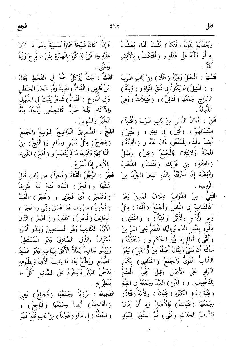(ف ج ر) : فَجَرَ الرَّجُلُ الْقَنَاةَ فَجْرًا مِنْ بَابِ قَتَلَ شَقَّهَا وَفَجَرَ الْمَاءَ فَتَحَ لَهُ طَرِيقًا فَانْفَجَرَ أَيْ فَجَرَى وَفَجَرَ الْعَبْدُ فُجُورًا مِنْ بَابِ قَعَدَ فَسَقَ وَزَنَى وَفَجَرَ الْحَالِفُ فُجُورًا كَذَبَ وَالْفَجْرُ اثْنَانِ الْأَوَّلُ الْكَاذِبُ وَهُوَ الْمُسْتَطِيلُ وَيَبْدُو أَسْوَدَ مُعْتَرِضًا وَالثَّانِي الصَّادِقُ وَهُوَ الْمُسْتَطِيرُ وَيَبْدُو سَاطِعًا يَمْلَأُ الْأُفُقَ بِبَيَاضِهِ وَهُوَ عَمُودُ الصُّبْحِ وَيَطْلُعُ بَعْدَ مَا يَغِيبُ الْأَوَّلُ وَبِطُلُوعِهِ يَدْخُلُ النَّهَارُ وَيَحْرُمُ عَلَى الصَّائِمِ كُلُّ مَا يُفْطِرُ بِهِ.