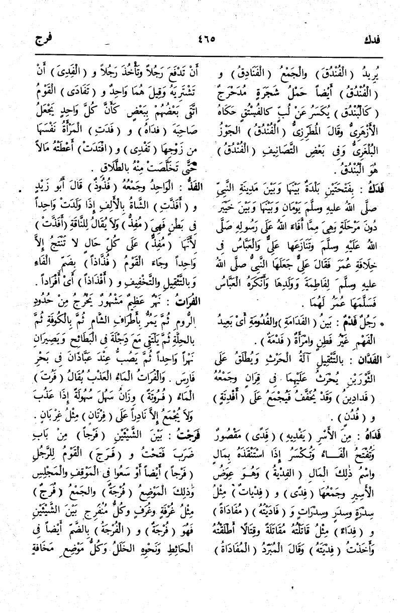 (ف د ك) : فَدَكُ بِفَتْحَتَيْنِ بَلْدَةٌ بَيْنَهَا وَبَيْنَ مَدِينَةِ النَّبِيِّ - صَلَّى اللهُ عَلَيْهِ وَسَلَّمَ - يَوْمَانِ وَبَيْنَهَا وَبَيْنَ خَيْبَرَ دُونَ مَرْحَلَةٍ وَهِيَ مِمَّا أَفَاءَ اللَّهُ عَلَى رَسُولِهِ - صَلَّى اللهُ عَلَيْهِ وَسَلَّمَ - وَتَنَازَعَهَا عَلِيٌّ وَالْعَبَّاسُ فِي خِلَافَةِ عُمَرَ فَقَالَ عَلِيٌّ جَعَلَهَا النَّبِيُّ - صَلَّى اللهُ عَلَيْهِ وَسَلَّمَ - لِفَاطِمَةَ وَوَلَدِهَا وَأَنْكَرَهُ الْعَبَّاسُ فَسَلَّمَهَا عُمَرُ لَهُمَا