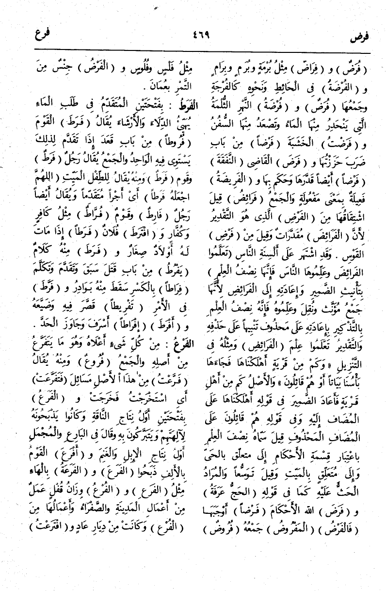 (ف ر ع) : الْفَرْعُ مِنْ كُلِّ شَيْءٍ أَعْلَاهُ وَهُوَ مَا يَتَفَرَّعُ مِنْ أَصْلِهِ وَالْجَمْعُ فُرُوعٌ وَمِنْهُ يُقَالُ فَرَّعْتُ مِنْ هَذَا الْأَصْلِ مَسَائِلَ فَتَفَرَّعَتْ أَيْ اسْتَخْرَجْتُ فَخَرَجَتْ وَالْفَرَعُ بِفَتْحَتَيْنِ أَوَّلُ نِتَاجِ النَّاقَةِ وَكَانُوا يَذْبَحُونَهُ لِآلِهَتِهِمْ وَيَتَبَرَّكُونَ بِهِ وَقَالَ فِي الْبَارِعِ وَالْمُجْمَلِ أَوَّلُ نِتَاجِ الْإِبِلِ وَالْغَنَمِ