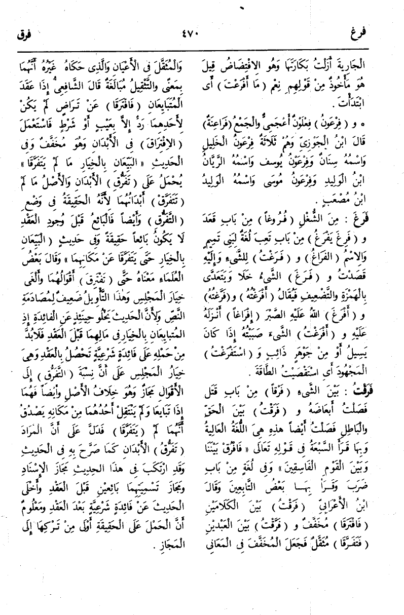 وَفِي لُغَةٍ مِنْ بَابِ ضَرَبَ وَقَرَأَ بِهَا بَعْضُ التَّابِعِينَ وَقَالَ ابْنُ الْأَعْرَابِيِّ فَرَقْتُ بَيْنَ الْكَلَامَيْنِ فَافْتَرَقَا مُخَفَّفٌ وَفَرَّقْتُ بَيْنَ الْعَبْدَيْنِ فَتَفَرَّقَا مُثَقَّلٌ فَجُعِلَ الْمُخَفَّفُ فِي الْمَعَانِي وَالْمُثَقَّلُ فِي الْأَعْيَانِ وَاَلَّذِي حَكَاهُ غَيْرُهُ أَنَّهُمَا بِمَعْنًى وَالتَّثْقِيلُ مُبَالَغَةٌ قَالَ الشَّافِعِيُّ إذَا عَقَدَ الْمُتَبَايِعَانِ فَافْتَرَقَا عَنْ تَرَاضٍ لَمْ يَكُنْ لِأَحَدِهِمَا رَدٌّ إلَّا بِعَيْبٍ أَوْ شَرْطٍ فَاسْتُعْمِلَ الِافْتِرَاقُ فِي الْأَبْدَانِ وَهُوَ مُخَفَّفٌ.