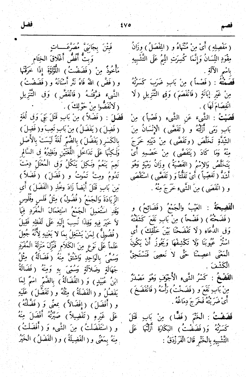 (ف ض ل) : فَضَلَ فَضْلًا مِنْ بَابِ قَتَلَ بَقِيَ وَفِي لُغَةٍ فَضِلَ يَفْضُلُ مِنْ بَابِ تَعِبَ وَفَضِلَ بِالْكَسْرِ يَفْضُلُ بِالضَّمِّ لُغَةٌ لَيْسَتْ بِالْأَصْلِ وَلَكِنَّهَا عَلَى تَدَاخُلِ اللُّغَتَيْنِ وَنَظِيرُهُ فِي السَّالِمِ نَعِمَ يَنْعُمُ وَنَكِلَ يَنْكُلُ وَفِي الْمُعْتَلِّ دِمْتَ تَدُومُ وَمِتَّ تَمُوتُ وَفَضَلَ فَضْلًا مِنْ بَابِ قَتَلَ أَيْضًا زَادَ وَخُذْ الْفَضْلَ أَيْ الزِّيَادَةَ وَالْجَمْعُ فُضُولٌ مِثْلُ فَلْسٍ وَفُلُوسٍ وَقَدْ اُسْتُعْمِلَ الْجَمْعُ اسْتِعْمَالَ الْمُفْرَدِ فِيمَا لَا خَيْرَ فِيهِ وَلِهَذَا نُسِبَ إلَيْهِ عَلَى لَفْظِهِ فَقِيلَ فُضُولِيٌّ لِمَنْ يَشْتَغِلُ بِمَا لَا يَعْنِيهِ لِأَنَّهُ جُعِلَ عَلَمًا عَلَى نَوْعٍ مِنْ الْكَلَامِ فَنُزِّلَ مَنْزِلَةَ الْمُفْرَدِ وَسُمِّيَ بِالْوَاحِدِ وَاشْتُقَّ مِنْهُ فَضَالَةٌ مِثْلُ جَهَالَةٍ وَضَلَالَةٍ وَسُمِّيَ بِهِ وَمِنْهُ فَضَالَةُ بْنُ عُبَيْدٍ وَالْفُضَالَةُ بِالضَّمِّ اسْمٌ لِمَا يَفْضُلُ وَالْفَضْلَةُ مِثْلُهُ وَتَفَضَّلَ عَلَيْهِ وَأَفْضَلَ إفْضَالًا بِمَعْنًى وَفَضَّلْتُهُ عَلَى غَيْرِهِ تَفْضِيلًا صَيَّرْتُهُ أَفْضَلَ مِنْهُ واسْتَفْضَلْتُ مِنْ الشَّيْءِ وَأَفْضَلْتُ مِنْهُ بِمَعْنًى وَالْفَضِيلَةُ وَالْفَضْلُ الْخَيْرُ