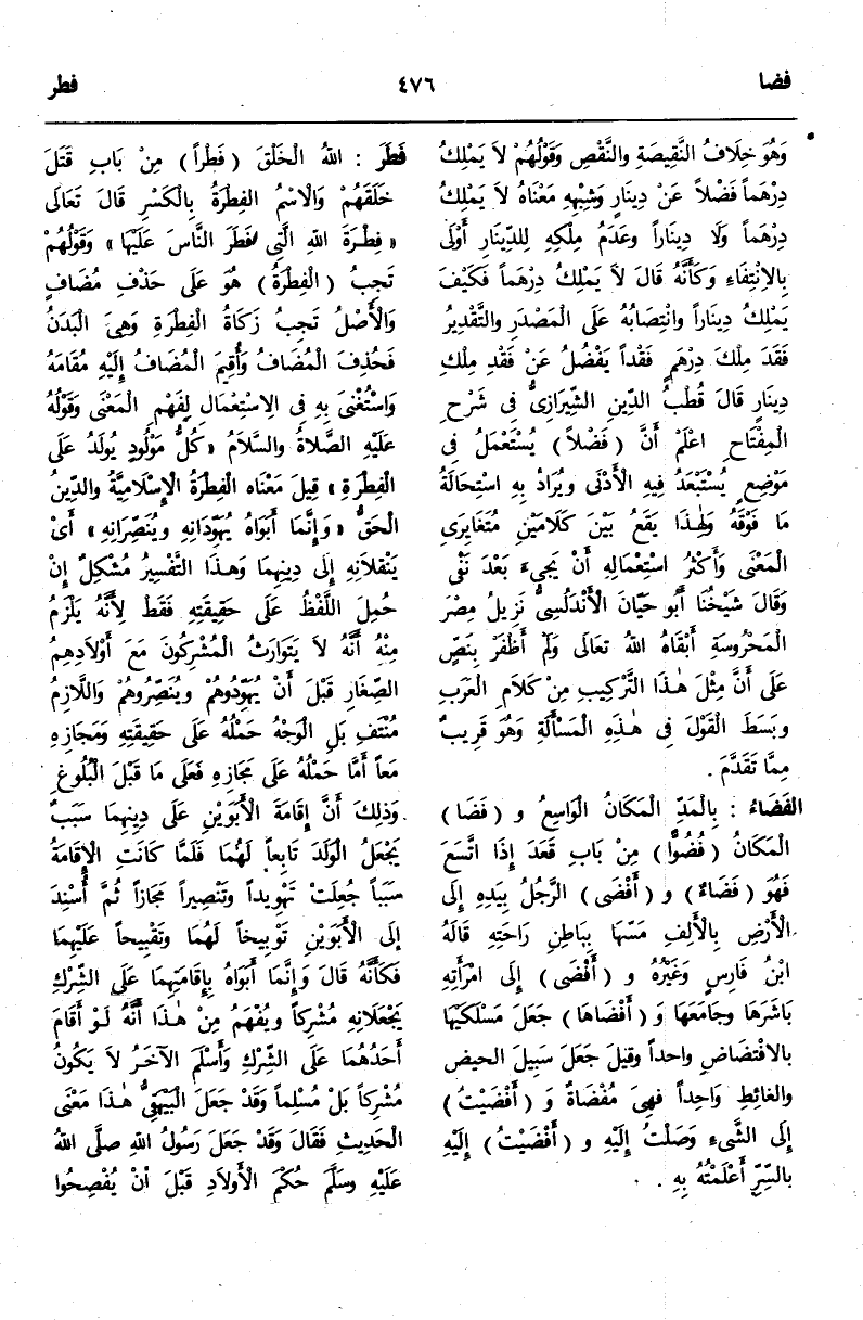 (ف ط ر) فَطَرَ اللَّهُ الْخَلْقَ فَطْرًا مِنْ بَابِ قَتَلَ خَلَقَهُمْ وَالِاسْمُ الْفِطْرَةُ بِالْكَسْرِ قَالَ تَعَالَى {فِطْرَتَ اللَّهِ الَّتِي فَطَرَ النَّاسَ عَلَيْهَا} [الروم: 30] وَقَوْلُهُمْ تَجِبُ الْفِطْرَةُ هُوَ عَلَى حَذْفِ مُضَافٍ وَالْأَصْلُ تَجِبُ زَكَاةُ الْفِطْرَةِ وَهِيَ الْبَدَنُ فَحُذِفَ الْمُضَافُ وَأُقِيمَ الْمُضَافُ إلَيْهِ مُقَامَهُ وَاسْتُغْنِيَ بِهِ فِي الِاسْتِعْمَالِ لِفَهْمِ الْمَعْنَى وَقَوْلُهُ - عَلَيْهِ الصَّلَاةُ وَالسَّلَامُ - «كُلُّ مَوْلُودٍ يُولَدُ عَلَى الْفِطْرَةِ» قِيلَ مَعْنَاه الْفِطْرَةُ الْإِسْلَامِيَّةُ وَالدِّينُ الْحَقُّ «وَإِنَّمَا أَبَوَاهُ يُهَوِّدَانِهِ وَيُنَصِّرَانِهِ» أَيْ يَنْقُلَانِهِ إلَى دِينِهِمَا وَهَذَا التَّفْسِيرُ مُشْكِلٌ إنْ حُمِلَ اللَّفْظُ عَلَى حَقِيقَتِهِ فَقَطْ لِأَنَّهُ يَلْزَمُ مِنْهُ أَنَّهُ لَا يَتَوَارَثُ الْمُشْرِكُونَ مَعَ أَوْلَادِهِمْ الصِّغَارِ قَبْلَ أَنْ يُهَوِّدُوهُمْ وَيُنَصِّرُوهُمْ وَاللَّامُ مُنْتَفٍ بَلْ الْوَجْهُ حَمْلُهُ عَلَى حَقِيقَتِهِ وَمَجَازِهِ مَعًا أَمَّا حَمْلُهُ عَلَى مَجَازِهِ فَعَلَى مَا قَبْلَ الْبُلُوغِ وَذَلِكَ أَنَّ إقَامَةَ الْأَبَوَيْنِ عَلَى دِينِهِمَا سَبَبٌ يَجْعَلُ الْوَلَدَ تَابِعًا لَهُمَا فَلَمَّا كَانَتْ الْإِقَامَةُ سَبَبًا جُعِلَتْ تَهْوِيدًا وَتَنْصِيرًا مَجَازًا ثُمَّ أُسْنِدَ إلَى الْأَبَوَيْنِ تَوْبِيخًا لَهُمَا وَتَقْبِيحًا عَلَيْهِمَا فَكَأَنَّهُ قَالَ وَإِنَّمَا أَبَوَاهُ بِإِقَامَتِهِمَا عَلَى الشِّرْكِ يَجْعَلَانِهِ مُشْرِكًا وَيُفْهَمُ مِنْ هَذَا أَنَّهُ لَوْ أَقَامَ أَحَدُهُمَا عَلَى الشِّرْكِ وَأَسْلَمَ الْآخَرُ لَا يَكُونُ مُشْرِكًا بَلْ مُسْلِمًا وَقَدْ جَعَلَ الْبَيْهَقِيّ هَذَا مَعْنَى الْحَدِيثِ فَقَالَ وَقَدْ جَعَلَ رَسُولُ اللَّهِ - صَلَّى اللهُ عَلَيْهِ وَسَلَّمَ - حُكْمَ الْأَوْلَادِ قَبْلَ أَنْ يُفْصِحُوا