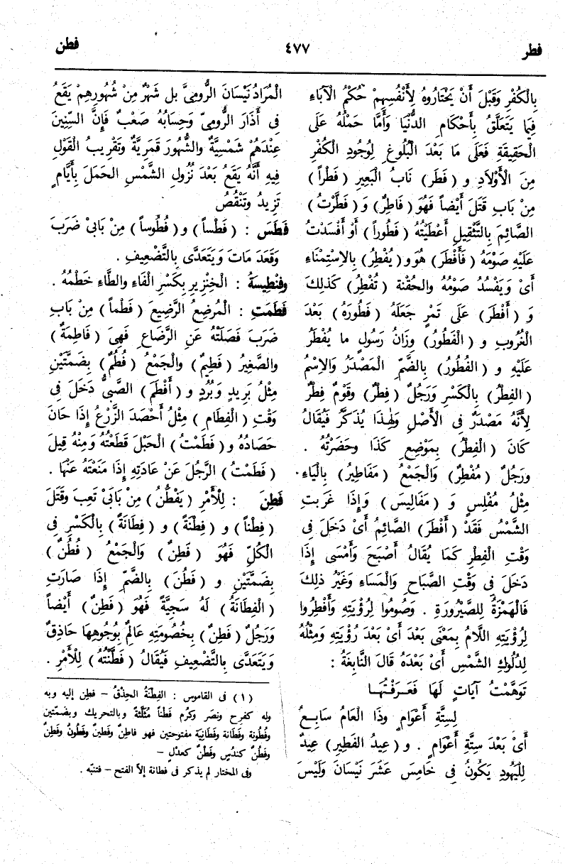 (¬1) فى القاموس: الفِطْنةُ الحِذْقُ- فطِن إليه وبه وله كفرح ونصَر وكرُم فَطناً مُثلَثه وبالتحريك وبضَمّتين وفُطُونة وفَطَانة وفَطَانِيَة مفتوحتين فهو فاطِنَ وفَطينً وفَطُونُ وفَطِنٌ وفَطْنٌ كندُس وفَطنٌ كعدْلِ- وفى المختار لم يذكر فى فطانة إلّا الفتح- فتنبّه.