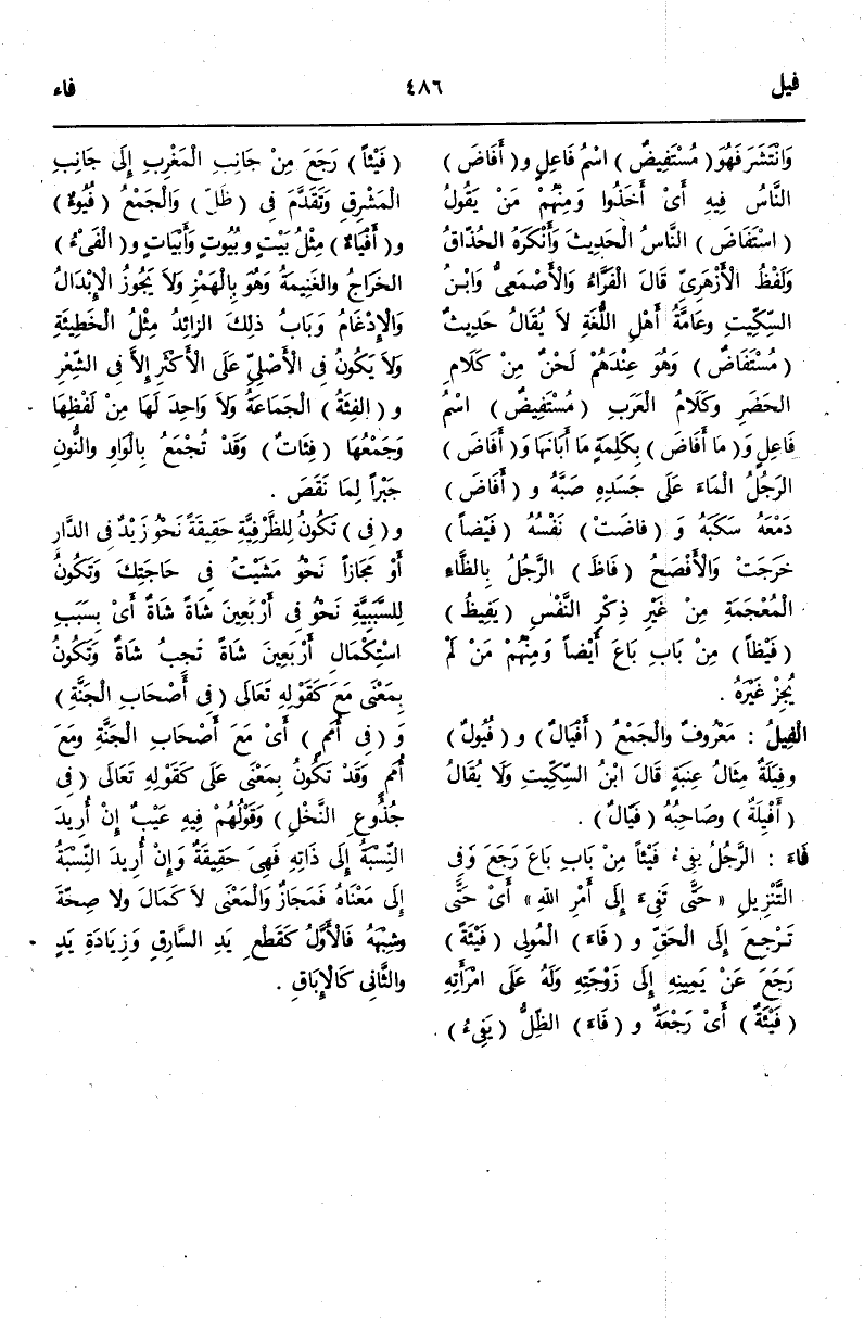 (ف يء) : فَاءَ الرَّجُلُ يَفِيءُ فَيْئًا مِنْ بَابِ بَاعَ رَجَعَ وَفِي التَّنْزِيلِ {حَتَّى تَفِيءَ إِلَى أَمْرِ اللَّهِ} [الحجرات: 9] أَيْ حَتَّى تَرْجِعَ إلَى الْحَقِّ وَفَاءَ الْمُولِي فَيْئَةً رَجَعَ عَنْ يَمِينِهِ إلَى زَوْجَتِهِ وَلَهُ عَلَى امْرَأَتِهِ فَيْئَةٌ أَيْ رَجْعَةٌ وَفَاءَ الظِّلُّ يَفِيءُ فَيْئًا رَجَعَ مِنْ جَانِبِ الْمَغْرِبِ إلَى جَانِب الْمَشْرِقِ وَتَقَدَّمَ فِي ظَلَّ وَالْجَمْعُ فُيُوءٌ وَأَفْيَاءٌ مِثْلُ بَيْتٍ وَبُيُوتٍ وَأَبْيَاتٍ.
