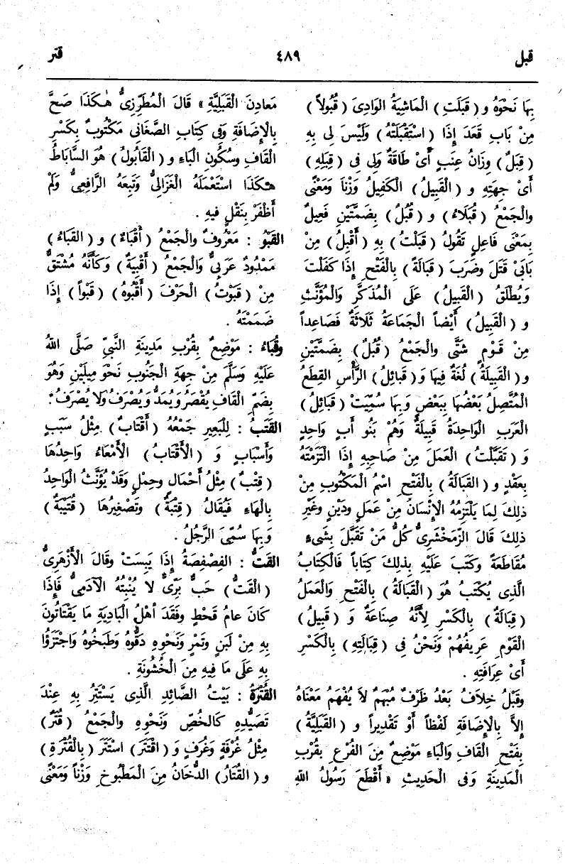 (ق ب و) : الْقَبْوُ مَعْرُوفٌ وَالْجَمْعُ أَقْبَاءُ وَالْقَبَاءُ مَمْدُودٌ عَرَبِيٌّ وَالْجَمْعُ أَقْبِيَةٌ وَكَأَنَّهُ مُشْتَقٌّ مِنْ قَبَوْتُ الْحَرْفَ أَقْبُوهُ قَبْوًا إذَا ضَمَمْتَهُ.