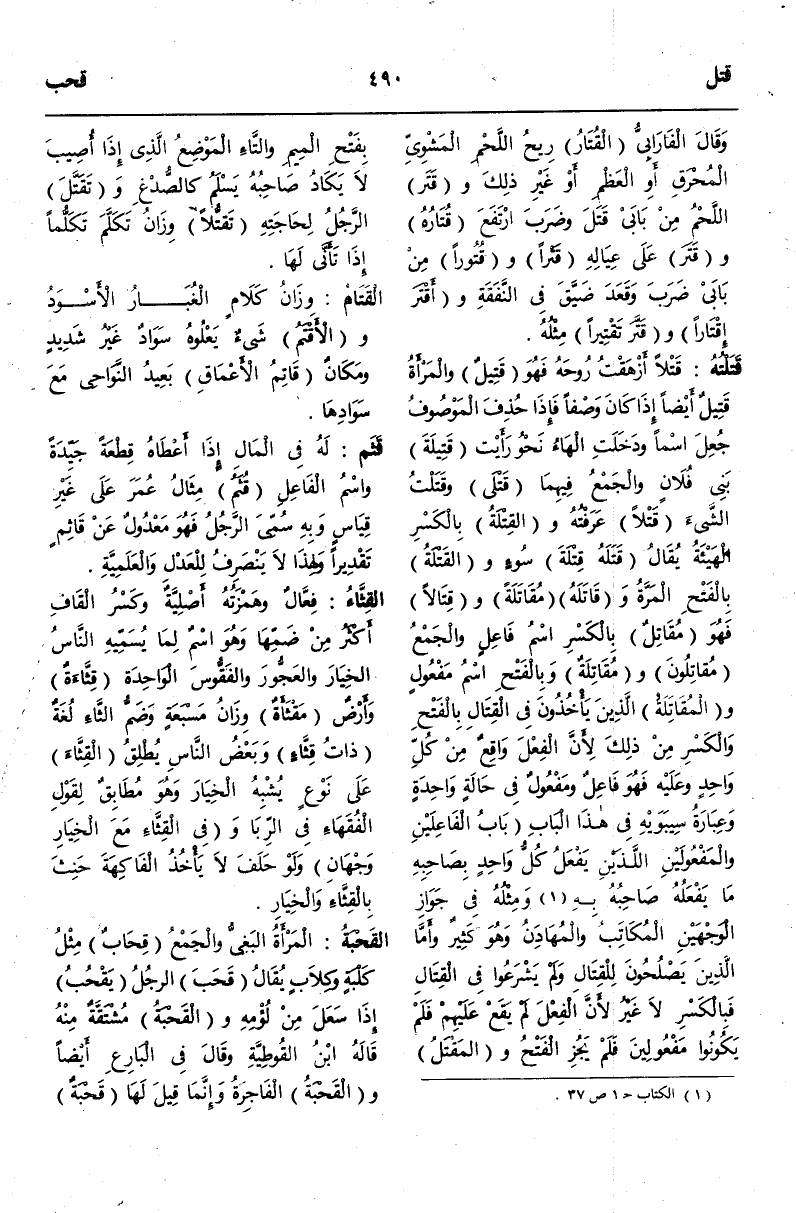 (ق ت ل) : قَتَلْتُهُ قَتْلًا أَزْهَقْتُ رُوحَهُ فَهُوَ قَتِيلٌ وَالْمَرْأَةُ قَتِيلٌ أَيْضًا إذَا كَانَ وَصْفًا فَإِذَا حُذِفَ الْمَوْصُوفُ جُعِلَ اسْمًا وَدَخَلَتْ الْهَاءُ نَحْوُ رَأَيْت قَتِيلَةَ بَنِي فُلَانٍ وَالْجَمْعُ فِيهِمَا قَتْلَى وَقَتَلْتُ الشَّيْءَ قَتْلًا عَرَفْتُهُ وَالْقِتْلَةُ بِالْكَسْرِ الْهَيْئَةُ يُقَالُ قَتَلَهُ قِتْلَةَ سُوءٍ وَالْقَتْلَةُ بِالْفَتْحِ الْمَرَّةُ وَقَاتَلَهُ مُقَاتَلَةً وَقِتَالًا فَهُوَ مُقَاتِلٌ بِالْكَسْرِ اسْمُ فَاعِلٍ وَالْجَمْعُ مُقَاتِلُونَ وَمُقَاتِلَةٌ وَبِالْفَتْحِ اسْمُ مَفْعُولٍ وَالْمُقَاتَلَةُ الَّذِينَ يَأْخُذُونَ فِي الْقِتَالِ بِالْفَتْحِ وَالْكَسْرِ مِنْ ذَلِكَ لِأَنَّ الْفِعْلَ وَاقِعٌ مِنْ كُلِّ وَاحِدٍ وَعَلَيْهِ فَهُوَ فَاعِلٌ وَمَفْعُولٌ فِي حَالَةٍ وَاحِدَةٍ وَعِبَارَةُ سِيبَوَيْهِ فِي هَذَا الْبَابِ بَابُ الْفَاعِلَيْنِ وَالْمَفْعُولَيْنِ اللَّذَيْنِ يَفْعَلُ كُلُّ وَاحِدٍ بِصَاحِبِهِ مَا يَفْعَلُهُ صَاحِبُهُ بِهِ (¬1) وَمِثْلُهُ فِي جَوَازِ الْوَجْهَيْنِ الْمُكَاتَبُ وَالْمُهَادَنُ وَهُوَ كَثِيرٌ وَأَمَّا الَّذِينَ يَصْلُحُونَ لِلْقِتَالِ وَلَمْ يَشْرَعُوا فِي الْقِتَالِ فَبِالْكَسْرِ لَا غَيْرُ لِأَنَّ الْفِعْلَ لَمْ يَقَعْ عَلَيْهِمْ فَلَمْ يَكُونُوا مَفْعُولِينَ فَلَمْ يَجُزْ الْفَتْحُ وَالْمَقْتَلُ بِفَتْحِ الْمِيمِ وَالتَّاءِ الْمَوْضِعُ الَّذِي إذَا أُصِيبَ لَا يَكَادُ صَاحِبُهُ يَسْلَمُ كَالصُّدْغِ وَتَقَتَّلَ الرَّجُلُ لِحَاجَتِهِ تَقَتُّلًا وِزَانُ تَكَلَّمَ تَكَلُّمًا إذَا تَأَنَّى لَهَا.