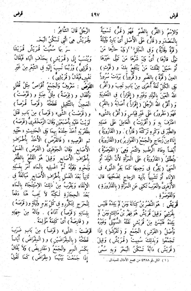 (ق ر ش) : قُرَيْشٌ هُوَ النَّضْرُ بْنُ كِنَانَةَ وَمَنْ لَمْ يَلِدْهُ فَلَيْسَ بِقُرَشِيٍّ وَقِيلَ قُرَيْشٌ هُوَ فِهْرُ بْنُ مَالِكٍ وَمَنْ لَمْ يَلِدْهُ فَلَيْسَ مِنْ قُرَيْشٍ نَقَلَهُ السُّهَيْلِيُّ وَغَيْرُهُ وَأَصْلُ الْقَرْشِ الْجَمْعُ وَتَقَرَّشُوا إذَا تَجَمَّعُوا وَبِذَلِكَ سُمِّيَتْ قُرَيْشٌ وَقِيلَ قُرَيْشٌ دَابَّةٌ تَسْكُنُ الْبَحْرَ وَبِهِ سُمِّيَ الرَّجُلُ قَالَ الشَّاعِرُ