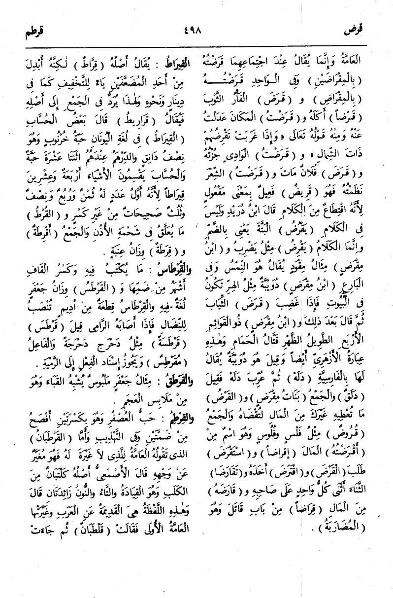 (ق ر ط) : الْقِيرَاطُ يُقَالُ أَصْلُهُ قِرَاطٌ لَكِنَّهُ أُبْدِلَ مِنْ أَحَدِ الْمُضَعَّفَيْنِ يَاءً لِلتَّخْفِيفِ كَمَا فِي دِينَارٍ وَنَحْوِهِ وَلِهَذَا يُرَدُّ فِي الْجَمْعِ إلَى أَصْلِهِ فَيُقَالُ قَرَارِيطُ قَالَ بَعْضُ الْحُسَّابِ الْقِيرَاطُ فِي لُغَةِ الْيُونَانِ حَبَّةُ خُرْنُوبٍ وَهُوَ نِصْفُ دَانِقٍ وَالدِّرْهَمُ عِنْدَهُمْ اثْنَتَا عَشْرَةَ حَبَّةً وَالْحُسَّابُ يَقْسِمُونَ الْأَشْيَاءَ أَرْبَعَةً وَعِشْرِينَ قِيرَاطًا لِأَنَّهُ أَوَّلُ عَدَدٍ لَهُ ثُمْنٌ وَرُبْعٌ وَنِصْفٌ وَثُلُثٌ صَحِيحَاتٌ مِنْ غَيْرِ كَسْرٍ.
