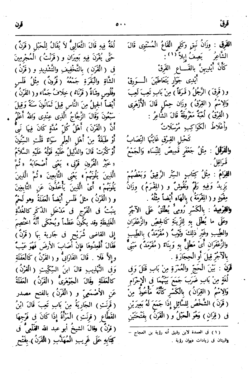 وَفِي لُغَةٍ مِنْ بَابِ ضَرَبَ جَمَعَ بَيْنَهُمَا فِي الْإِحْرَامِ وَالِاسْمُ الْقِرَانُ بِالْكَسْرِ كَأَنَّهُ مَأْخُوذٌ مِنْ قَرَنَ الشَّخْصُ لِلسَّائِلِ إذَا جَمَعَ لَهُ بَعِيرَيْنِ فِي قِرَانٍ وَهُوَ الْحَبْلُ وَالْقَرَنُ بِفَتْحَتَيْنِ لُغَةٌ فِيهِ قَالَ الثَّعَالِبِيُّ لَا يُقَالُ لِلْحَبْلِ قَرَنٌ حَتَّى يُقْرَنَ فِيهِ بَعِيرَانِ وَقَرَنْتُ الْمُجْرِمِينَ فِي الْقَرَنِ بِالتَّخْفِيفِ وَالتَّشْدِيدِ وَقَرْنُ الشَّاةِ وَالْبَقَرَةِ جَمْعُهُ قُرُونٌ مِثْلُ فَلْسٍ وَفُلُوسٍ وَشَاةٌ قَرْنَاءُ خِلَافُ جَمَّاءَ وَالْقَرْنُ أَيْضًا الْجِيلُ مِنْ النَّاسِ قِيلَ ثَمَانُونَ سَنَةً وَقِيلَ سَبْعُونَ.