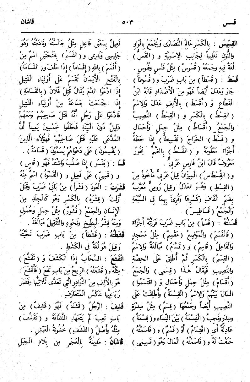 (ق س س) : الْقِسِّيسُ بِالْكَسْرِ عَالِمُ النَّصَارَى وَيُجْمَعُ بِالْوَاوِ وَالنُّونِ تَغْلِيبًا لِجَانِبِ الِاسْمِيَّةِ وَالْقَسُّ لُغَةٌ فِيهِ وَجَمْعُهُ قُسُوسٌ مِثْلُ فَلْسٍ وَفُلُوسٍ.