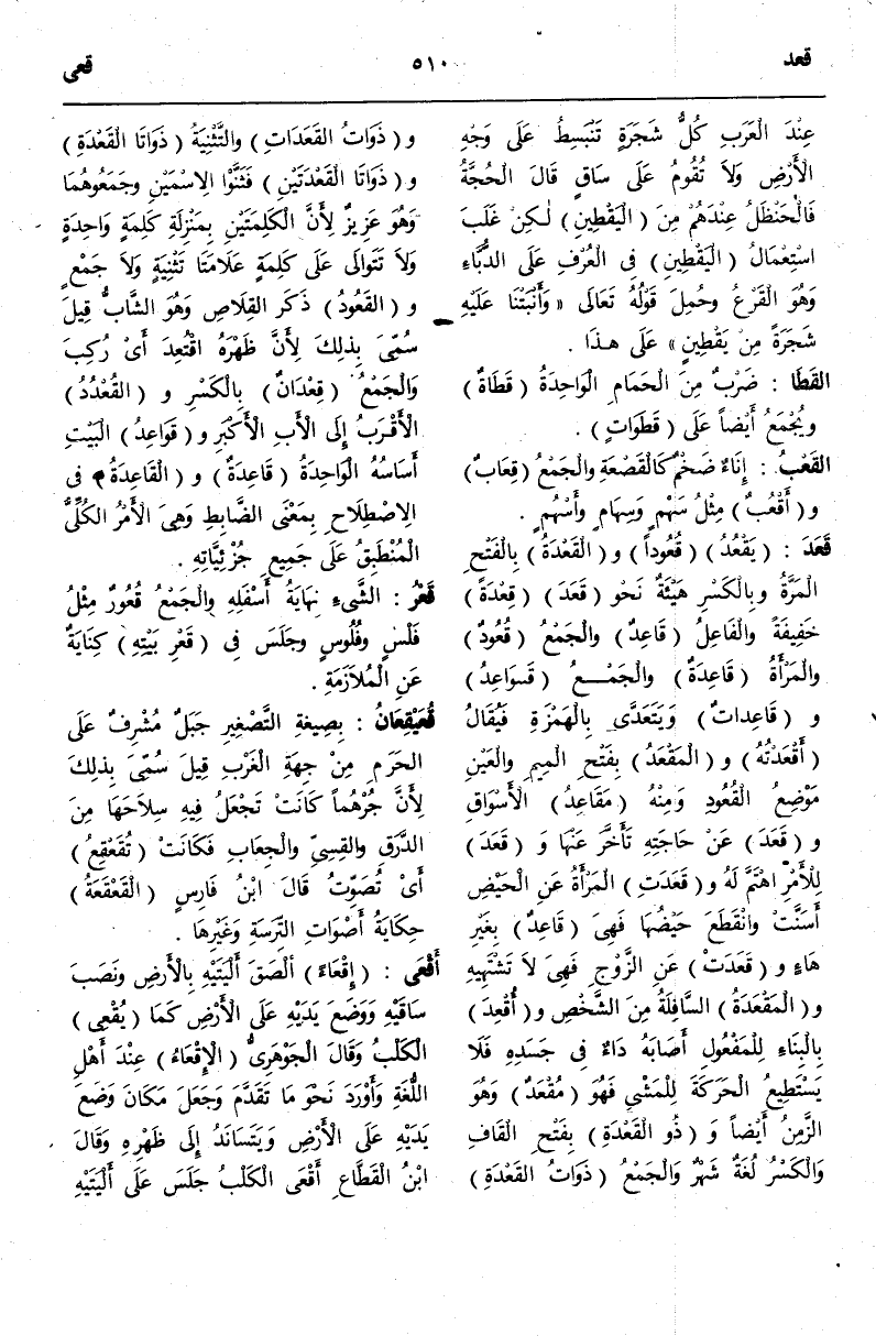 (ق ع د) : قَعَدَ يَقْعُدُ قُعُودًا وَالْقَعْدَةُ بِالْفَتْحِ الْمَرَّةُ وَبِالْكَسْرِ هَيْئَةٌ نَحْوَ قَعَدَ قِعْدَةً خَفِيفَةً وَالْفَاعِلُ قَاعِدٌ وَالْجَمْعُ قُعُودٌ وَالْمَرْأَةُ قَاعِدَةٌ وَالْجَمْعُ قَوَاعِدُ وَقَاعِدَاتٌ وَيَتَعَدَّى بِالْهَمْزَةِ فَيُقَالُ أَقْعَدْتُهُ وَالْمَقْعَدُ بِفَتْحِ الْمِيمِ وَالْعَيْنِ مَوْضِعُ الْقُعُودِ وَمِنْهُ مَقَاعِدُ الْأَسْوَاقِ وَقَعَدَ عَنْ حَاجَتِهِ تَأَخَّرَ عَنْهَا وَقَعَدَ لِلْأَمْرِ اهْتَمَّ لَهُ.