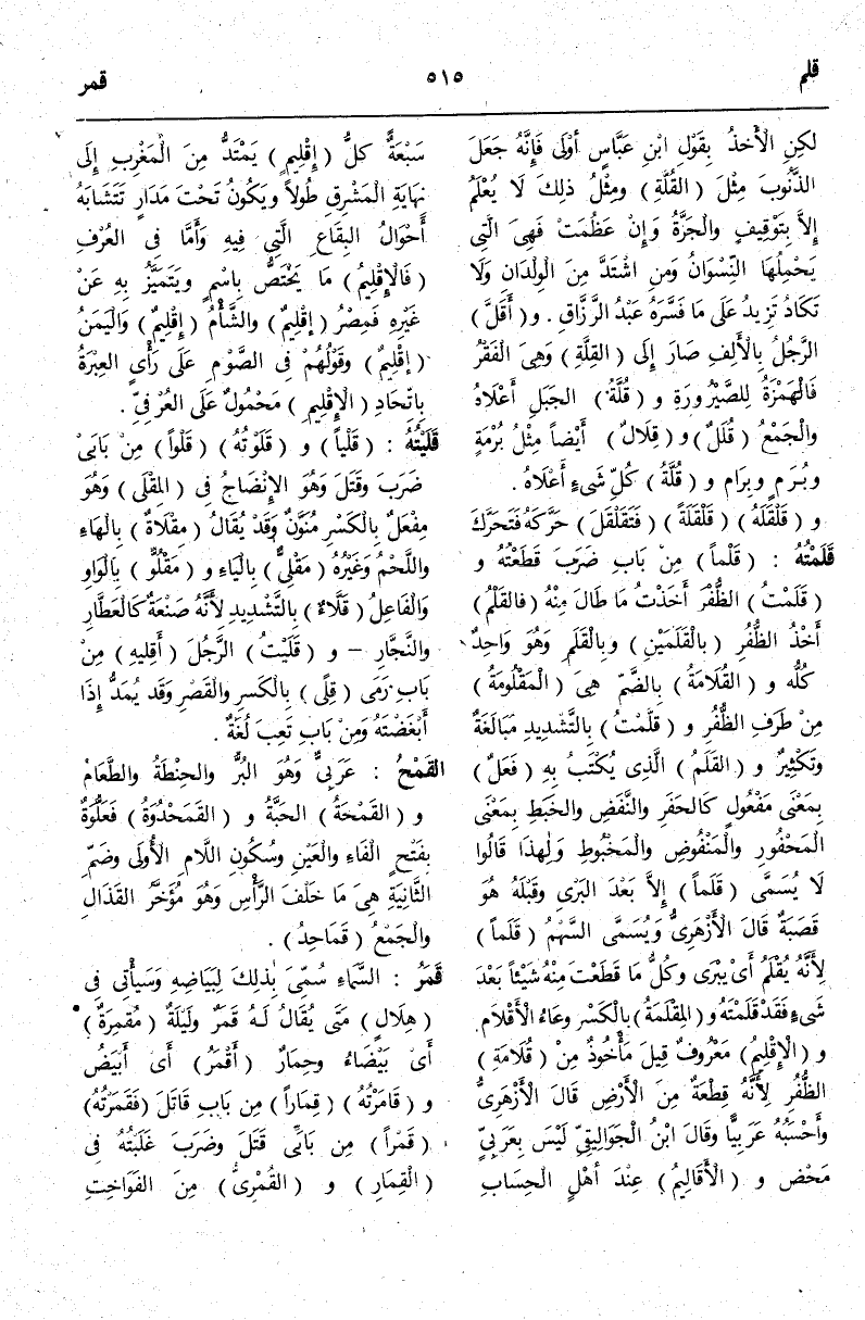 (ق ل م) : قَلَمْتُهُ قَلْمًا مِنْ بَابِ ضَرَبَ قَطَعْتُهُ وَقَلَمْتُ الظُّفْرَ أَخَذْتُ مَا طَالَ مِنْهُ فَالْقَلْمُ أَخْذُ الظُّفُرِ بِالْقَلَمَيْنِ وَبِالْقَلَمِ وَهُوَ وَاحِدٌ كُلُّهُ وَالْقُلَامَةُ بِالضَّمِّ هِيَ الْمَقْلُومَةُ مِنْ طَرَفِ الظُّفُرِ وَقَلَّمْتُ بِالتَّشْدِيدِ مُبَالَغَةٌ وَتَكْثِيرٌ وَالْقَلَمُ الَّذِي يُكْتَبُ بِهِ فَعَلًا بِمَعْنَى مَفْعُولٍ كَالْحُفَرِ وَالنَّفَضِ وَالْخَبَطِ بِمَعْنَى الْمَحْفُورِ وَالْمَنْفُوضِ وَالْمَخْبُوطِ وَلِهَذَا قَالُوا لَا يُسَمَّى قَلَمًا إلَّا بَعْدَ الْبَرْيِ وَقَبْلَهُ هُوَ قَصَبَةٌ قَالَ الْأَزْهَرِيُّ وَيُسَمَّى السَّهْمُ قَلَمًا لِأَنَّهُ يُقْلَمُ أَيْ يُبْرَى وَكُلُّ مَا قَطَعْتَ مِنْهُ شَيْئًا بَعْدَ شَيْءٍ فَقَدْ قَلَمْتَهُ وَالْمِقْلَمَةُ بِالْكَسْرِ وِعَاءُ الْأَقْلَامِ وَالْإِقْلِيمُ مَعْرُوفٌ قِيلَ مَأْخُوذٌ مِنْ قُلَامَةِ الظُّفُرِ لِأَنَّهُ قِطْعَةٌ مِنْ الْأَرْضِ قَالَ الْأَزْهَرِيُّ وَأَحْسَبُهُ عَرَبِيًّا.