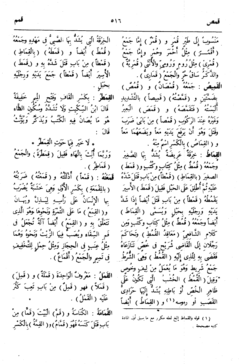 (ق م ط) : الْقِمَاطُ خِرْقَةٌ عَرِيضَةٌ يُشَدُّ بِهَا الصَّغِيرُ وَجَمْعُهُ قُمُطٌ مِثْلُ كِتَابٍ وَكُتُبٍ وَقَمَطَ الصَّغِيرَ بِالْقِمَاطِ قَمْطًا مِنْ بَابِ قَتَلَ شَدَّهُ عَلَيْهِ ثُمَّ أُطْلِقَ عَلَى الْحَبْلِ فَقِيلَ قَمَطَ الْأَسِيرَ يَقْمُطُهُ قَمْطًا مِنْ بَابِ قَتَلَ أَيْضًا إذَا شَدَّ يَدَيْهِ وَرِجْلَيْهِ بِحَبْلٍ وَيُسَمَّى الْقِمَاطَ أَيْضًا وَجَمْعُهُ قُمُطٌ مِثْلُ كِتَابٍ وَكُتُبٍ وَمِنْ كَلَامِ الشَّافِعِيِّ مَعَاقِدُ الْقُمُطِ وَتَحَاكَمَ رَجُلَانِ إلَى الْقَاضِي شُرَيْحٍ فِي خُصٍّ تَنَازَعَاهُ فَقَضَى بِهِ لِلَّذِي إلَيْهِ الْقُمُطُ وَهِيَ الشُّرُطُ جَمْعُ شَرِيطٍ وَهُوَ مَا يُعْمَلُ مِنْ لِيفٍ وَخُوصٍ وَقِيلَ الْقُمُطُ الْخُشُبُ الَّتِي تَكُونُ عَلَى ظَاهِرِ الْخُصِّ أَوْ بَاطِنِهِ يُشَدُّ إلَيْهَا حَرَادِيُّ الْقَصَبِ أَوْ رُءُوسِهِ وَالْقِمَاطُ أَيْضًا الْخِرْقَةُ الَّتِي يُشَدُّ بِهَا الصَّبِيُّ فِي مَهْدِهِ وَجَمْعُهُ قُمُطٌ أَيْضًا وَقَمَطَهُ بِالْقِمَاطِ قَمْطًا مِنْ بَابِ قَتَلَ شَدَّهُ بِهِ وَقَمَطَ الْأَسِيرَ أَيْضًا قَمْطًا جَمَعَ يَدَيْهِ وَرِجْلَيْهِ بِحَبْلٍ.