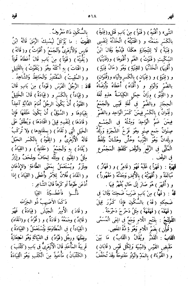 (ق ود) : قَادَ الرَّجُلُ الْفَرَسَ قَوْدًا مِنْ بَابِ قَالَ وَقِيَادًا بِالْكَسْرِ وَقِيَادَةً قَالَ الْخَلِيلُ الْقَوْدُ أَنْ يَكُونَ الرَّجُلُ أَمَامَ الدَّابَّةِ آخِذًا بِقِيَادِهَا وَالسَّوْقُ أَنْ يَكُونَ خَلْفَهَا فَإِنْ قَادَهَا لِنَفْسِهِ قِيلَ اقْتَادَهَا وَيُطْلَقُ عَلَى الْخَيْلِ الَّتِي تُقَادُ بِمَقَاوِدِهَا وَلَا تُرْكَبُ قَالَهُ الْأَزْهَرِيُّ وَالْمِقْوَدُ بِالْكَسْرِ الْحَبْلُ يُقَادُ بِهِ وَالْجَمْعُ مَقَاوِدُ وَالْقِيَادُ مِثْلُ الْمِقْوَدِ وَمِثْلُهُ لِحَافٌ وَمِلْحَفٌ وَإِزَارٌ وَمِئْزَرٌ وَيُسْتَعْمَلُ بِمَعْنَى الطَّاعَةِ وَالْإِذْعَانِ وَانْقَادَ فُلَانٌ لِلْأَمْرِ وَأَعْطَى الْقِيَادَ إذَا أَذْعَنَ طَوْعًا أَوْ كَرْهًا قَالَ الشَّاعِرُ